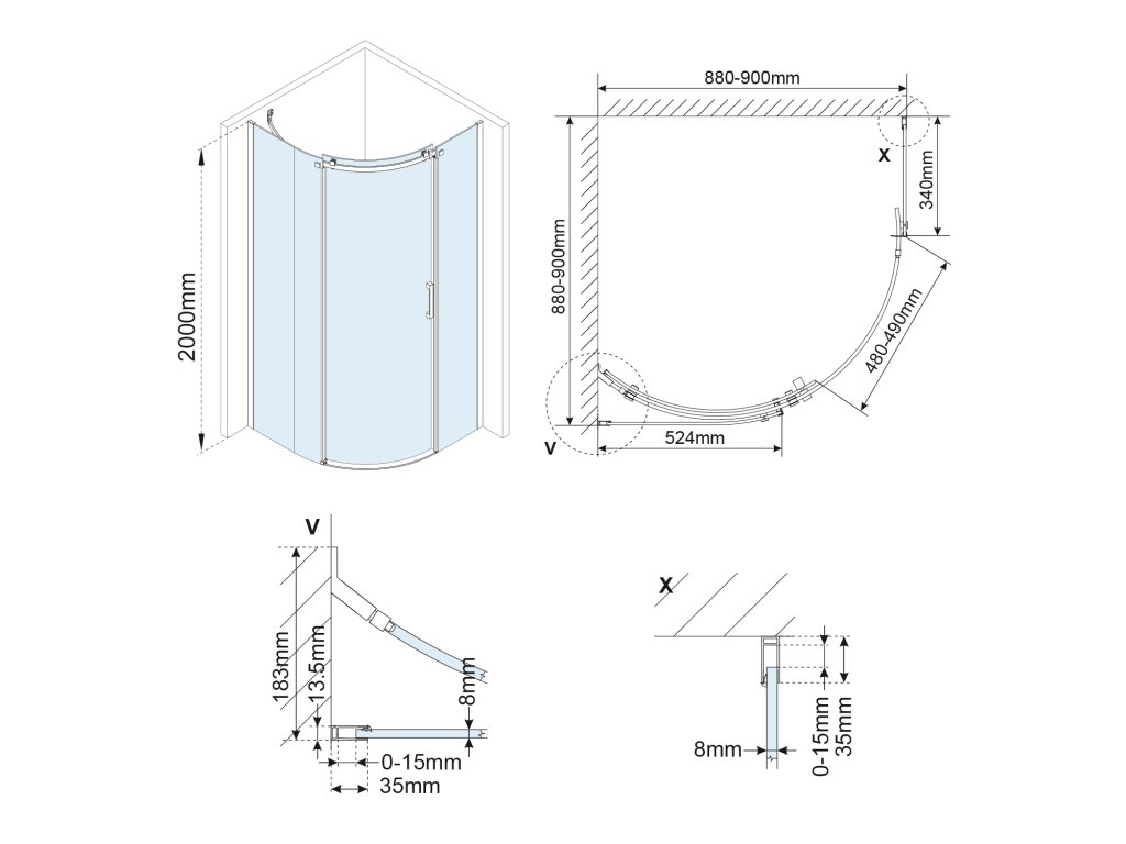 AKCE čtvrtkruhová sprchová zástěna 900x900x1900mm, čiré sklo