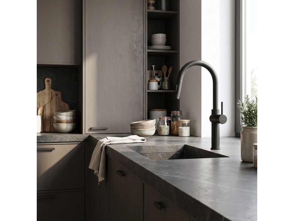 Zvyšte funkčnost mycí zóny s kuchyňskou baterií Rea Fresh High Black. Tento model v provedení matná černá spojuje moderní minimalistický design s maximálním komfortem používání. Pevné tělo z mosazi a odolný povrch vytvořený procesem electroplatingu jsou zárukou spolehlivosti i v náročných kuchyňských podmínkách.Výsuvná koncovka výtoku – praktické řešení na flexibilní hadici, které usnadňuje mytí velkého nádobí, oplachování zeleniny i důkladné čištění dřezových vaniček.Přepínač proudu vody – ergonomické tlačítko na výtoku umožňuje rychlou změnu typu proudu podle aktuální potřeby (souvislý proud nebo sprchový režim).Vysoký, otočný výtok – konstrukce s otočením o 360° zajišťuje velký pracovní dosah a volnost pohybu, což oceníte při napouštění vysokých hrnců.Mosazné tělo – materiál, který zajišťuje stabilitu baterie a vysokou odolnost proti korozi i změnám tlaku vody.Povrch Electroplating – matná černá úprava nanesená galvanicky (electroplating). Tato technologie zajišťuje dokonale hladký povrch a výjimečnou odolnost proti oděru a mechanickému poškození.Design Black Mat – štíhlá linie a sytá černá skvěle kontrastují se světlými pracovními deskami a hodí se do loftových i skandinávských kuchyní.Kuchyňská baterie Rea Fresh High Black je nástroj pro náročné. Díky technologii electroplating si její černý povrch zachovává bezchybný vzhled po dlouhá léta a zůstává elegantním i odolným prvkem vybavení.