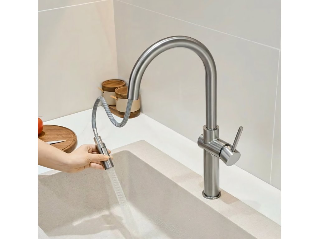 Zvyšte funkčnost své mycí zóny díky kuchyňské baterii Rea Fresh High. Tento model v provedení Kartáčovaný nikl spojuje moderní industriální design s maximálním pohodlím při používání. Pevné tělo z mosazi a odolná PVD povrchová úprava jsou zárukou spolehlivosti i v náročných kuchyňských podmínkách.Výsuvná koncovka výtoku – praktické řešení s flexibilní hadicí, usnadňuje mytí velkých nádob, oplachování zeleniny i důkladné čištění dřezu.Přepínač proudu vody – ergonomické tlačítko na výtoku umožňuje rychlou změnu typu proudu podle aktuální potřeby.Vysoký, otočný výtok – konstrukce typu „U“ s možností otáčení poskytuje velký pracovní dosah a volnost pohybu, ideální při napouštění vysokých hrnců.Mosazné tělo – materiál zajišťující stabilitu baterie a odolnost proti korozi i změnám tlaku vody.PVD povrch Kartáčovaný nikl – technologie zvyšující odolnost proti poškrábání, vysoké teplotě a změnám barvy, zároveň se snadno čistí.Vysoký design – štíhlá linie a matná úprava se skvěle hodí k nerezovým spotřebičům (inox) i moderním kuchyním.Kuchyňská baterie Rea Fresh High je nástroj pro náročné kuchaře. Pevné zpracování a moderní estetika z ní dělají ideální volbu do současné kuchyně.