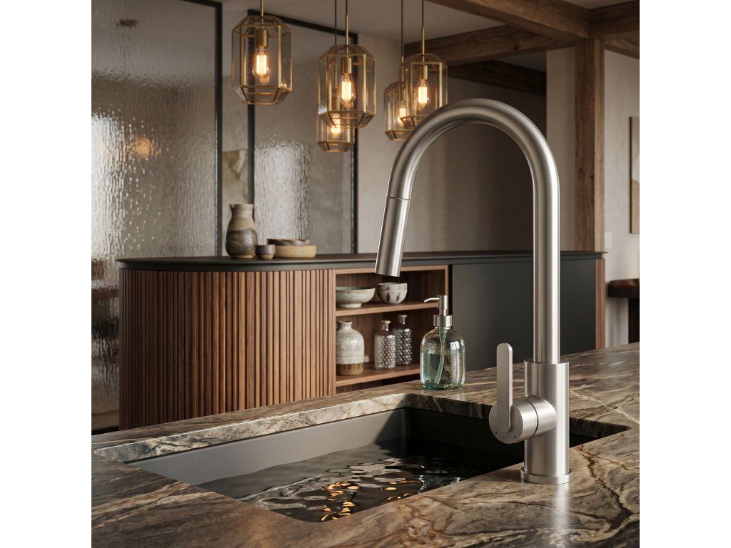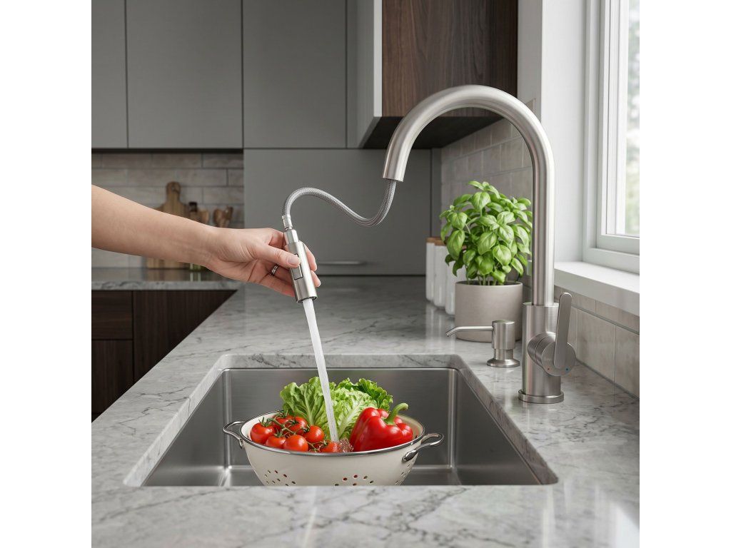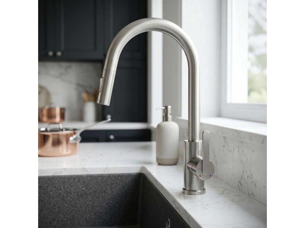Kuchyňská baterie Ontario v barvě kartáčovaného niklu je spojením moderní ergonomie a univerzálního designu. Navržena s ohledem na každodenní pohodlí, představuje elegantní a mimořádně praktický prvek vybavení současné kuchyně.Povrchová úprava Kartáčovaný nikl (PVD) – povlak nanesený technologií PVD se vyznačuje nejvyšší odolností a odolností proti poškrábání. Decentní saténový odstín niklu dodává interiéru profesionální vzhled a snadno se udržuje v čistotě.Vytahovací výtok – flexibilní hadice s vytahovací koncovkou značně zvyšuje pracovní dosah, což usnadňuje mytí vysokého nádobí a čištění dřezu.Dva režimy proudu – tlačítko na sprše umožňuje okamžitou změnu mezi proudy vody.Otočný výtok – plně pohyblivé rameno usnadňuje každodenní kuchyňské práce, což je důležité zejména u dvoukomorových dřezů.Robustní mosazné tělo – vyrobeno z vysoce kvalitní mosazi, což zaručuje stabilitu, odolnost proti korozi a spolehlivost po dlouhá léta.Volbou baterie Ontario získáte funkční nástroj, který zefektivní vaše domácí povinnosti a vnese do kuchyně akcent v barvě kartáčovaného niklu v moderním vydání.