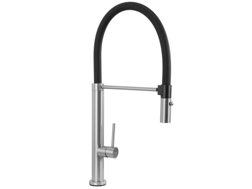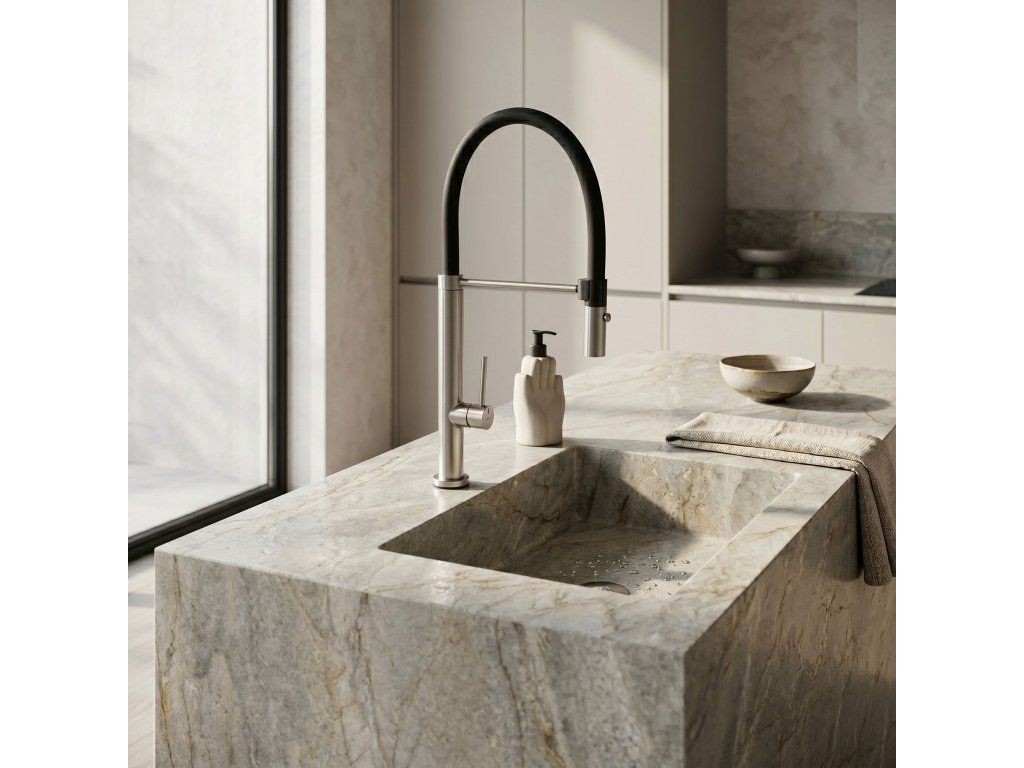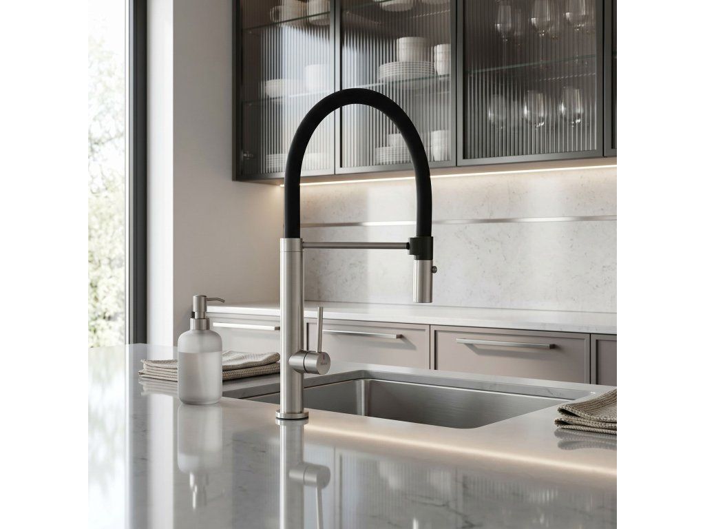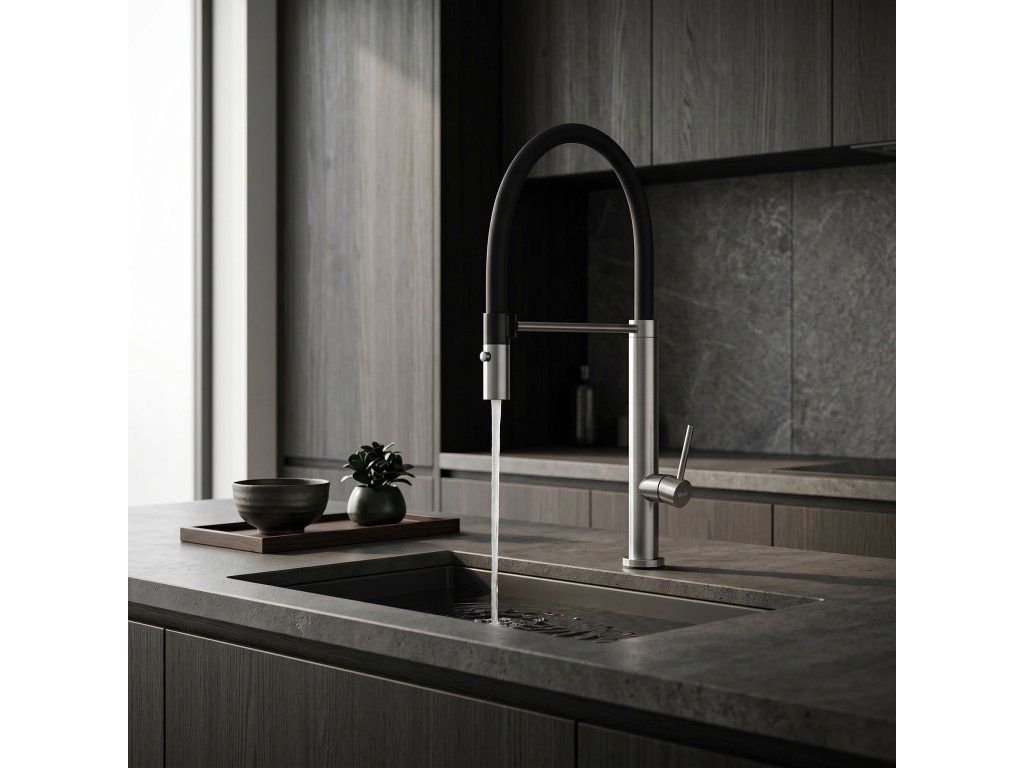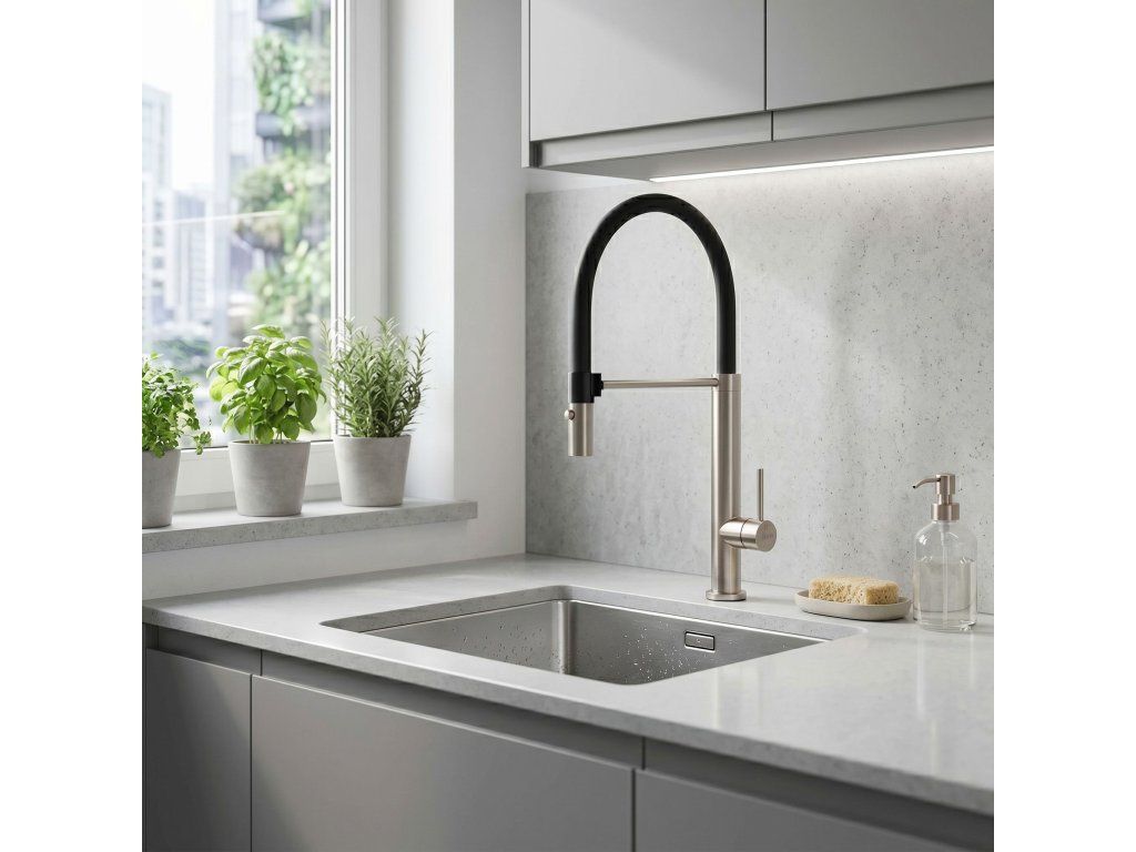 Kuchyňská baterie Rea Viera v provedení kartáčovaný nikl (Brushed Nickel) je vynikající volbou pro ty, kteří ocení střídmý luxus a moderní ergonomii. Její unikátní konstrukce, inspirovaná profesionálními restauračními kuchyněmi, je oděna do ušlechtilé, chladné barvy niklu, která tvoří harmonický celek s matnou černí flexibilního prvku. Tato armatura spojuje syrovost formy s nejvyšším komfortem používání.Povrchová úprava kartáčovaný nikl – decentní, saténový povrch s chladným odstínem, který představuje elegantní alternativu ke klasickému chromu. Díky procesu kartáčování jsou na baterii mnohem méně viditelné usazeniny vody a otisky prstů.Technologie PVD – povlak nanášený ve vakuu zajišťuje extrémní tvrdost a odolnost proti mechanickému poškození, čímž chrání barvu před matnutím a korozí po dlouhá léta.Profesionální výtok typu „Spring“ – černá, ohebná hadice umožňuje dosáhnout proudem vody do každého koutu dřezu. Flexibilita konstrukce usnadňuje oplachování velkých plechů nebo plnění vysokých hrnců.Dvoufunkční sprchová koncovka – tlačítko na hlavici umožňuje okamžitou změnu typu proudu: od provzdušněného pro mytí rukou po silný sprchový proud pro oplachování zeleniny.Solidní stabilizační rameno – horizontální podpěra v barvě niklu udržuje výtok v pevné, estetické poloze.Spolehlivá keramická kartuše – zajišťuje přesné nastavení teploty a síly průtoku, což zaručuje dlouhodobou těsnost a plynulý chod rukojeti.Mosazná konstrukce Premium – vyrobeno z vysoce kvalitní mosazi, což zaručuje odolnost vůči vysokému tlaku a stabilitu celé baterie.