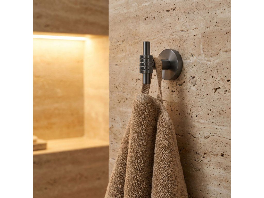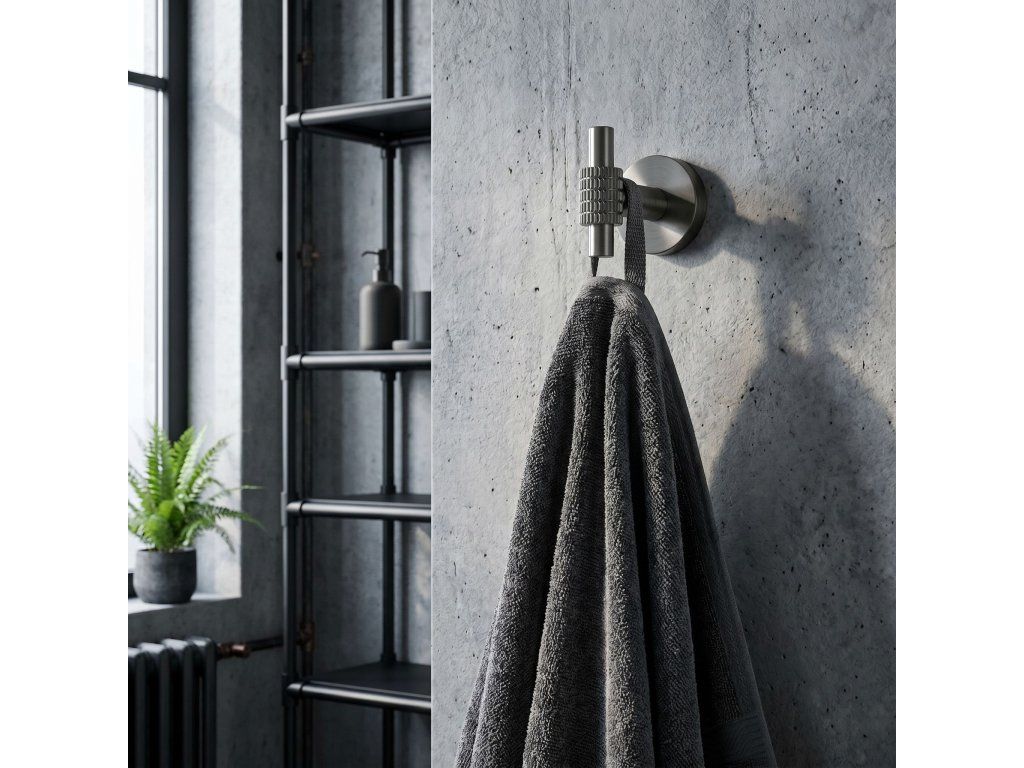 Sázejte na moderní strohost a technickou dokonalost s koupelnovým věšákem Rivo v titanovém provedení. Tento designový háček je kvintesencí mužného, moderního stylu, který do koupelny vnáší atmosféru profesionálního designového studia a luxusního minimalismu.Hluboká barva Kartáčovaný titan – tmavý, grafitový povrch se saténovou texturou je skvělou alternativou ke klasické černé nebo chromu. Titanová vrstva dodává interiéru rozhodný loftový charakter a je mimořádně odolná vůči otiskům prstů.Industriální vroubkování – charakteristická moletovaná struktura na těle, typická pro sérii Rivo, podtrhuje strohý technický design věšáku. Jde o detail, který nejen zdobí, ale dává produktu unikátní texturu.Funkční konstrukce T-bar – symetrická stavba tyčky umožňuje stabilní zavěšení textilií a zabraňuje jejich sklouzávání, což je klíčové pro zachování estetického řádu ve sprše nebo u umyvadla.Solidní kovová báze – použití vysoce kvalitních kovových slitin zajišťuje věšáku váhu a stabilitu typickou pro prémiové produkty a plnou odolnost vůči vodní páře.Neviditelný systém upevnění – díky montáži na vruty skryté pod ozdobnou rozetou věšák dokonale přiléhá ke stěně a prezentuje bezchybnou formu bez viditelných technických prvků.Série Rivo Titanium – věšák je součástí širší kolekce, což umožňuje ideální sladění držáků, mýdelníků nebo baterií ve stejném, unikátním odstínu titanu.Volbou koupelnového věšáku Rivo Titan investujete do doplňku, který odolá zkoušce času jak z hlediska kvality, tak designu. Je to ideální akcent pro tmavé interiéry, betonové koupelny a prostory, kde dominuje moderní elegance s technologickým nádechem.