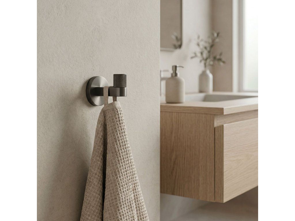 Dbejte na pořádek a elegantní detail ve své koupelně s bodovým koupelnovým věšákem Ori v barvě titanu. Tento stylový, kompaktní háček dokonale zapadá do nejnovějších trendů a kombinuje minimalistickou formu se šperkovým zakončením.Povrchová úprava Titan – hluboký, tmavě šedý odstín titanu dodává interiéru moderní, lehce industriální a mimořádně elegantní charakter. Kartáčovaný povrch usnadňuje údržbu a účinně maskuje drobné stopy používání.Ozdobné vroubkování – přední část věšáku byla obohacena o precizní, vroubkovanou strukturu. Tento decentní, rýhovaný detail představuje jedinečnou ozdobu, která přitahuje pohled a zdůrazňuje vysokou kvalitu zpracování produktu.Robustní kovová konstrukce – vyrobení z vysoce kvalitního kovu zaručuje plnou stabilitu, odolnost a odolnost proti vlhkosti v koupelně, ideálně se hodí i pod váhu ručníků nebo županů.Pevná montáž na stěnu – věšák se upevňuje na vruty, což zajišťuje maximální bezpečnost při každodenním používání. Skrytý systém upevnění umožňuje zachovat dokonalou estetiku na stěně.Kompletní kolekce – v naší nabídce najdete i další doplňky ze série Ori, díky čemuž vytvoříte ucelené a harmonické uspořádání celého interiéru.Výběrem koupelnového věšáku Ori kartáčovaný titan volíte ideální spojení moderního designu s napolehlivou funkčností.