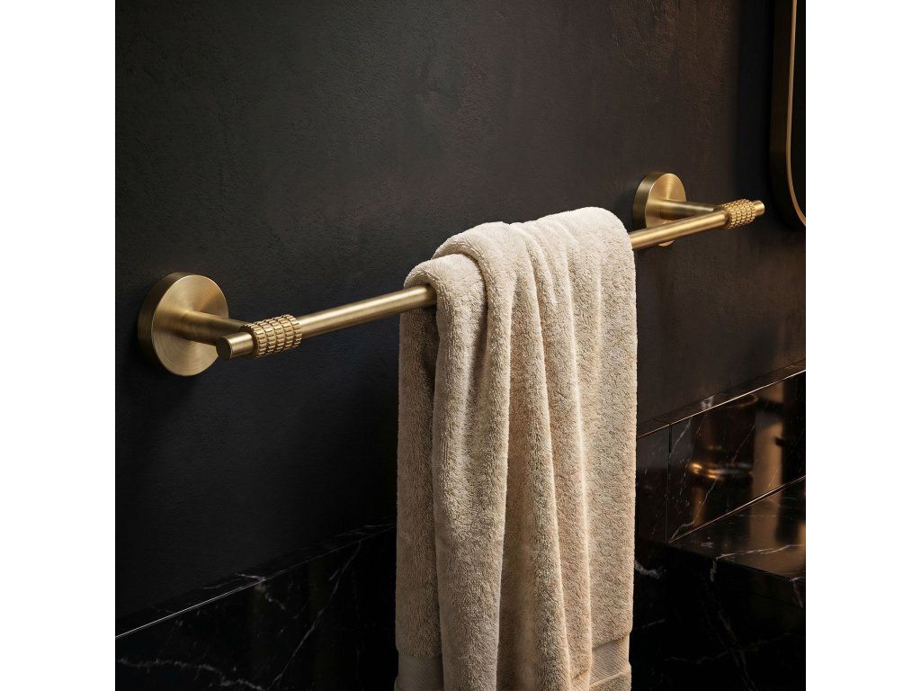 Podtrhněte luxusní charakter své koupelny s jednoramenným koupelnovým věšákem Rivo v provedení kartáčované zlato. Tato výjimečná tyč je kvintesencí moderní elegance, která kombinuje minimalistickou, štíhlou formu s unikátním šperkovým detailem a vytváří tak na stěně vaší koupelny efektní vizuální prvek.Exkluzivní povrch Kartáčované zlato – matná, saténová vrstva dodává doplňku prestižní vzhled a ušlechtilý lesk. Povrch je mimořádně odolný vůči otiskům prstů a šmouhám, což usnadňuje údržbu čistoty.Ozdobné vroubkování (Knurling) – charakteristickým prvkem série Rivo je moletované zdobení na koncích tyče. Tato industriální textura dodává produktu charakter a svědčí o nejvyšší preciznosti zpracování. Czech
