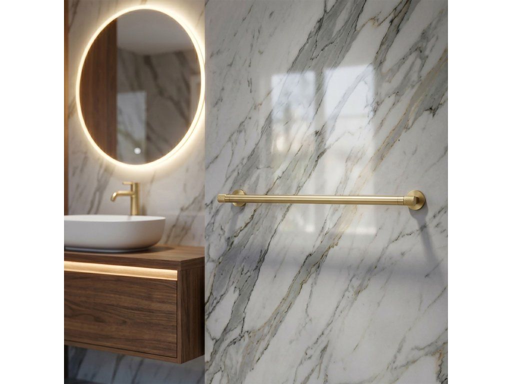 Jednoramenný věšák Ori v barvě Brushed Gold je funkční doplněk, který spojuje elegantní design s vysokou kvalitou zpracování. Díky svému jednoduchému tyčovému tvaru je ideální pro zavěšení ručníků, čímž pomáhá udržovat pořádek v každé moderní koupelně.Povrchová úprava Brushed Gold – matný povlak dodává věšáku moderní vzhled a zároveň je velmi praktický, protože účinně snižuje viditelnost skvrn od vody a otisků prstů.Pevná kovová konstrukce – zpracování z vysoce kvalitního kovu zaručuje odolnost proti mechanickému poškození a dlouholetou trvanlivost výrobku i při každodenní zátěži.Jednoramenná konstrukce – horizontální linie tyče umožňuje pohodlné rozložení ručníku, což zajišťuje adekvátní větrání a urychluje schnutí.Dvoubodová montáž na stěnu – použití pevného uchycení ve dvou bodech zaručuje plnou stabilitu věšáku.Kompletní kolekce Ori – model patří do široké řady koupelnových doplňků, což umožňuje vytvořit vizuálně ucelenou a plně funkční sadu vybavení.Výběrem věšáku z kolekce Ori investujete do detailu, který dělá rozdíl. Díky rýhovaným povrchovým úpravám a pevné konstrukci se jedná o produkt pro lidi hledající doplňky s charakterem, které vydrží roky intenzivního používání.