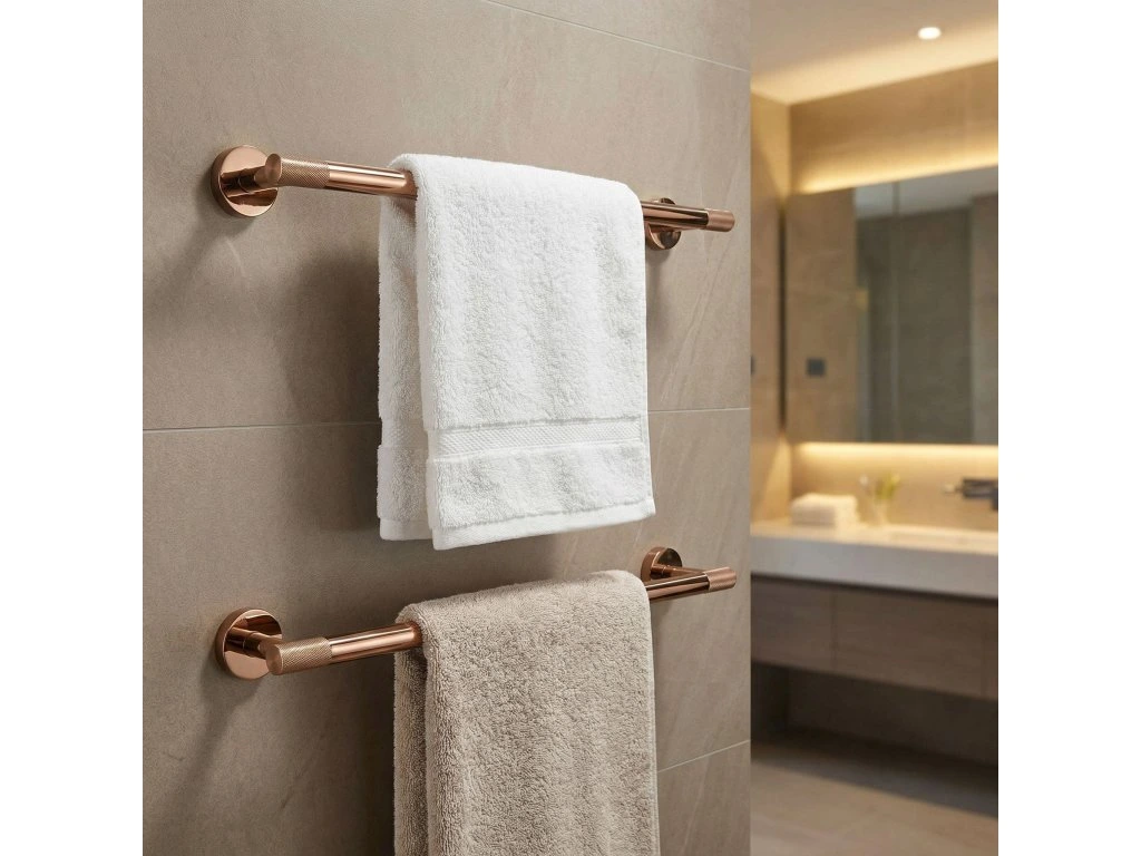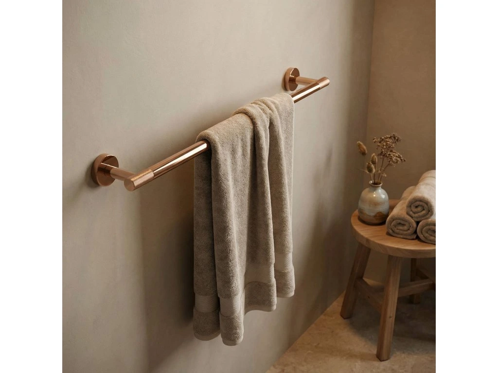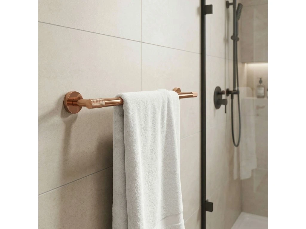 Zajistěte si dokonalý pořádek a minimalistický styl ve své koupelně díky věšáku na ručníky Modern 60 cm. Jeho univerzální povrchová úprava v barvě mědi dokonale zapadá do moderních trendů a spojuje eleganci s praktickým využitím. Vyroben z vysoce kvalitních materiálů, zajišťuje odolnost a plnou odolnost proti vlhkosti, což zaručuje spolehlivost na dlouhá léta.Vysoce kvalitní kov – zaručuje odolnost proti korozi a každodennímu používání ve vlhkém koupelnovém prostředí.Elegantní měděná povrchová úprava – dodává interiéru luxusní charakter a dokonale ladí s moderní armaturou.Šířka 60 cm – optimální délka umožňující volné zavěšení a rychlé schnutí osušek.Možnost zkrácení trubky – umožňuje ideální přizpůsobení rozměru věšáku dostupnému prostoru ve Vaší koupelně.Vroubkované zdobení – unikátní textura na koncích úchytů dodává moderní, industriální šmrnc a odlišuje produkt od klasických řešení.Solidní montáž přišroubováním – zajišťuje maximální stabilitu a jistotu upevnění i při větším zatížení.Věšák na ručníky Modern 60 cm je vynikající volbou pro osoby oceňující harmonické spojení estetiky a funkčnosti. Díky jednoduché, a přesto sofistikované linii se tento produkt stává decentní ozdobou každé koupelnové zóny. Výběrem tohoto řešení získáváte jistotu, že Vaše ručníky budou vždy na svém místě, což koupelně dodá třídu a moderní lesk.