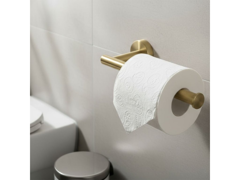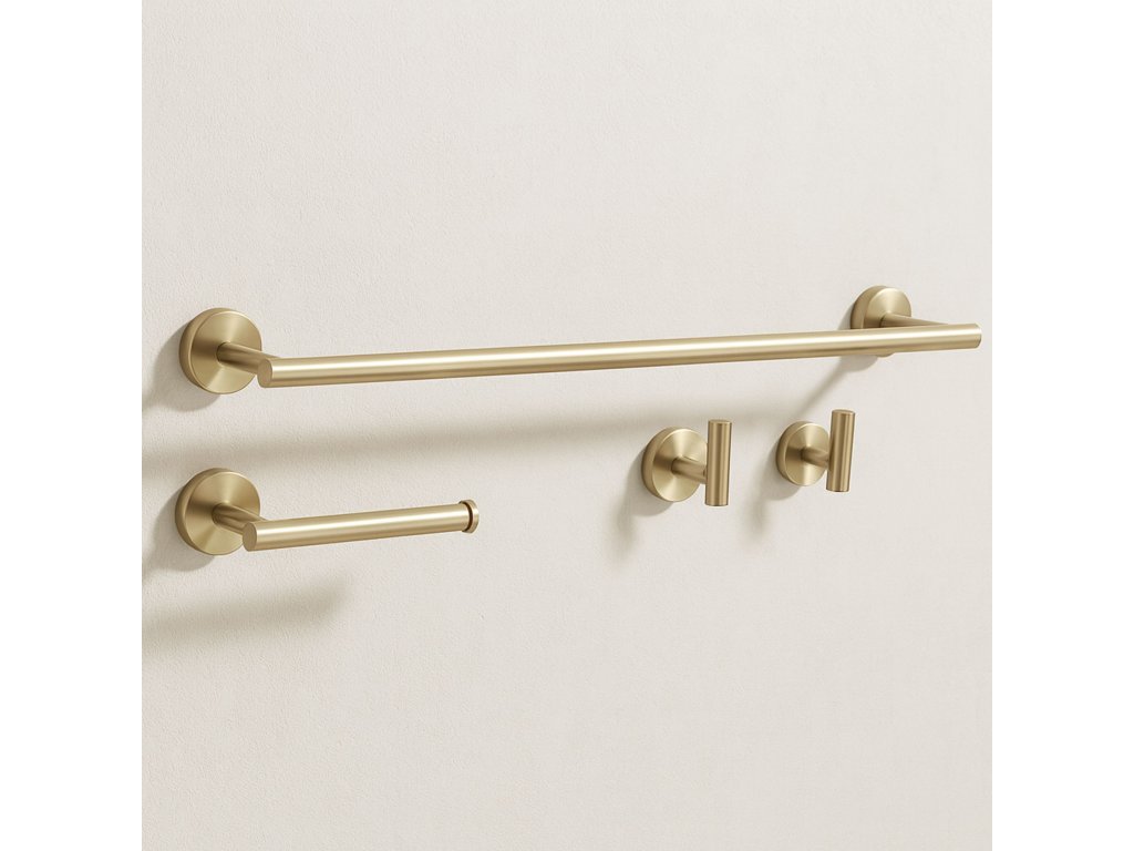 Všechny prvky jsou vyrobeny z vysoce kvalitního kovu, odolného proti vlhkosti a korozi. Povrch v barvě kartáčovaného zlata dodává celku eleganci a jemný lesk, přičemž zůstává odolný proti stopám používání. Doplňky jsou montovány na stěnu, což zaručuje stabilitu, trvanlivost a pohodlí při každodenním používání.