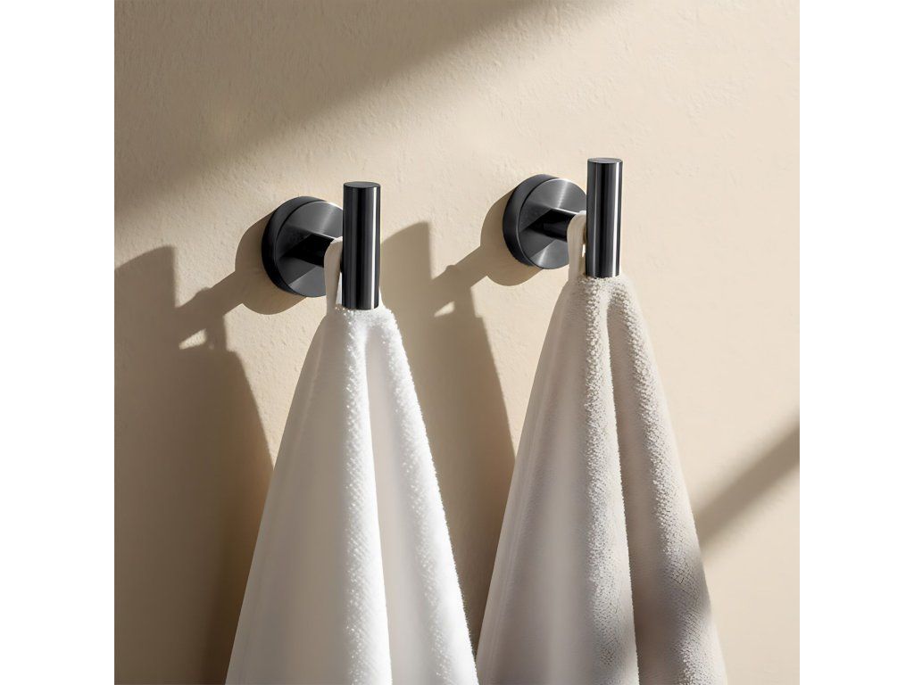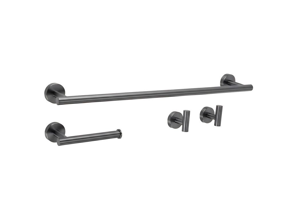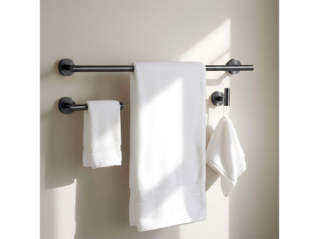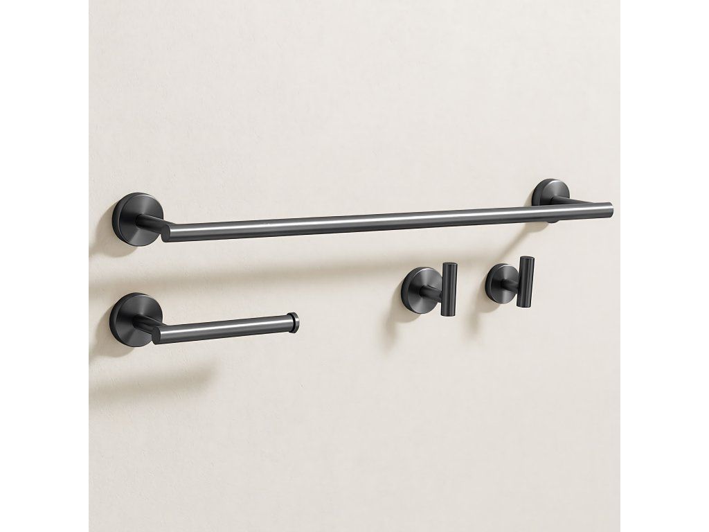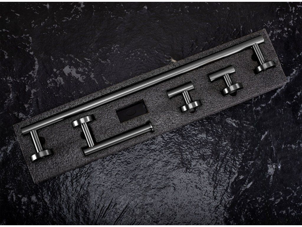 Všechny prvky jsou vyrobeny z kvalitního kovu, odolného vůči vlhkosti a korozi. Kartáčovaný povrch dodává celku eleganci a jemný lesk a zároveň si zachovává odolnost vůči stopám používání. Doplňky se montují na stěnu, což zajišťuje stabilitu, dlouhou životnost a pohodlí při každodenním používání.
