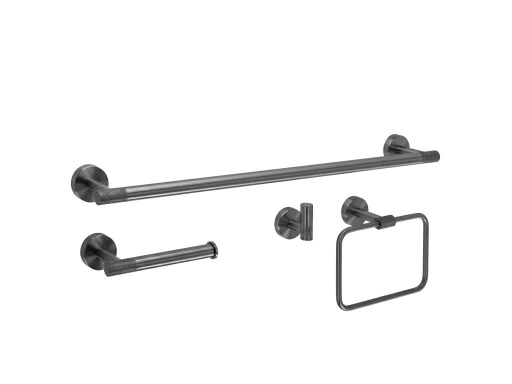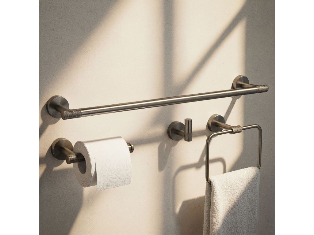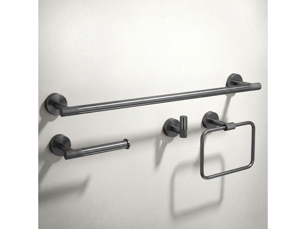 Sada koupelnových doplňků Grid je elegantní a funkční řešení, které se dokonale hodí do každé moderní koupelny. Součástí sady je držák na velký ručník, držák na toaletní papír, háček a kruh na ručník, čímž vytváří jednotný a stylový celek pro každodenní použití.