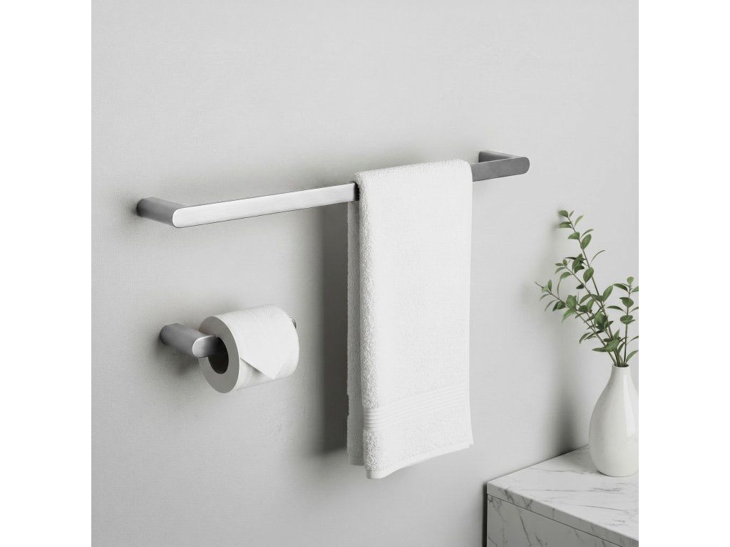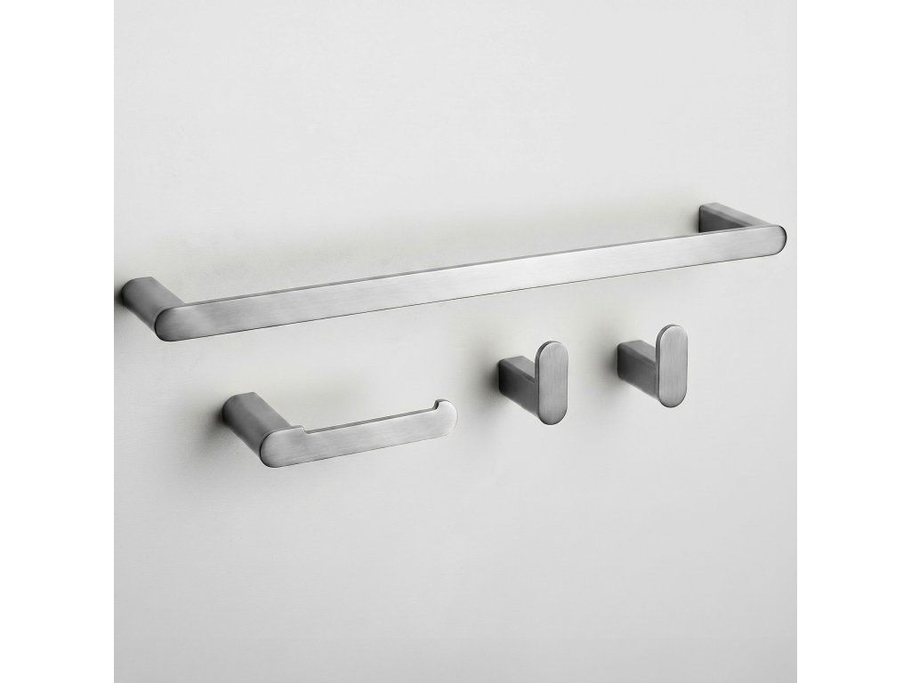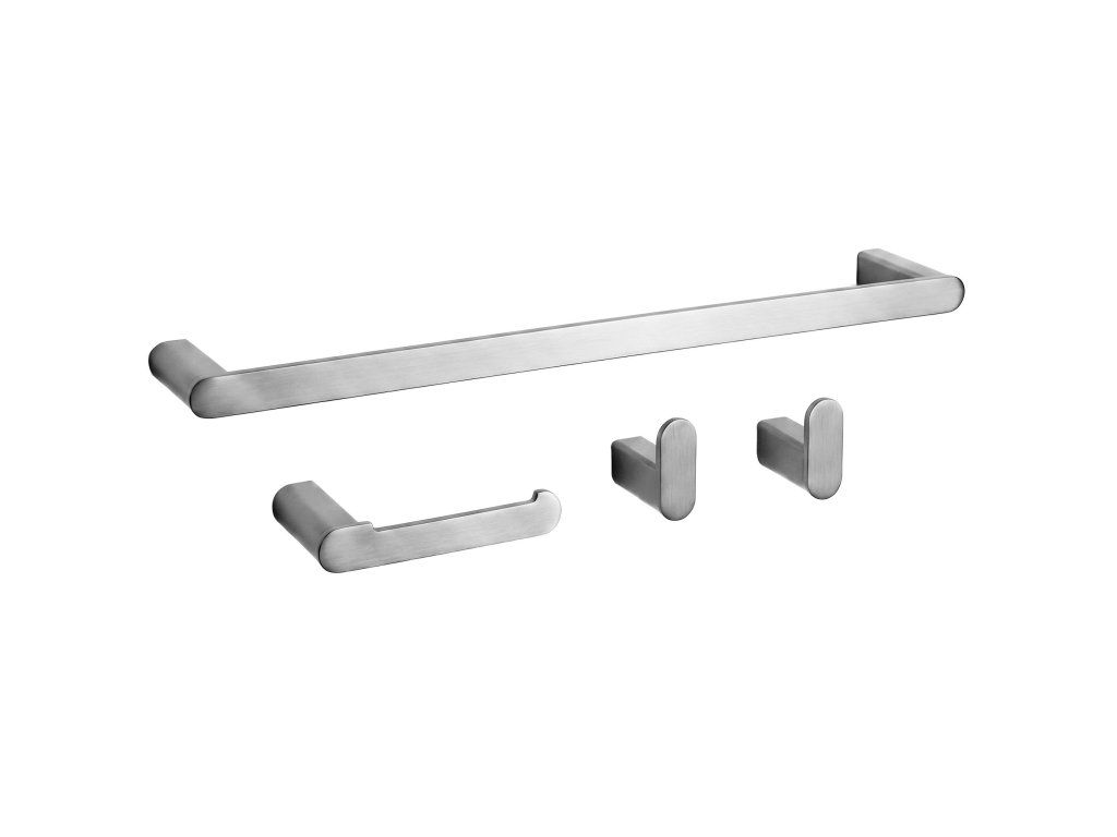 Sada koupelnových doplňků Rio je dokonalým spojením odolnosti, funkčnosti a elegantního designu. Součástí sady je podlouhý věšák na ručník, držák na toaletní papír a dva háčky, které tvoří jednotný a estetický celek do každé moderní koupelny.