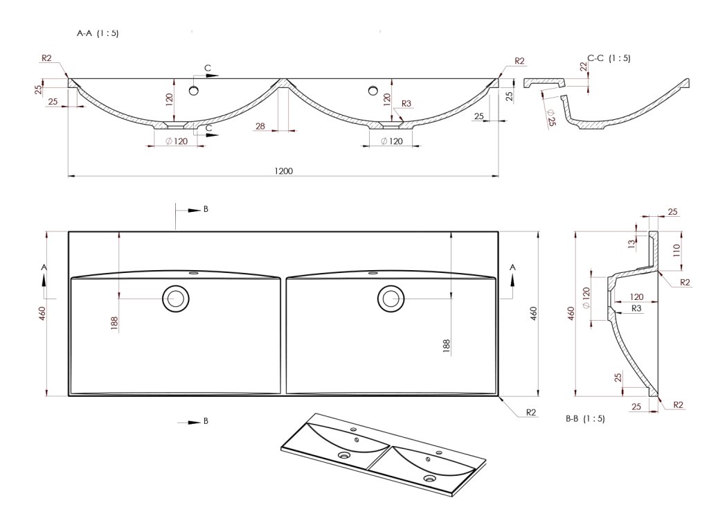 MARIA dvojumyvadlo, litý mramor, 120x46cm, bez otvoru, bílá