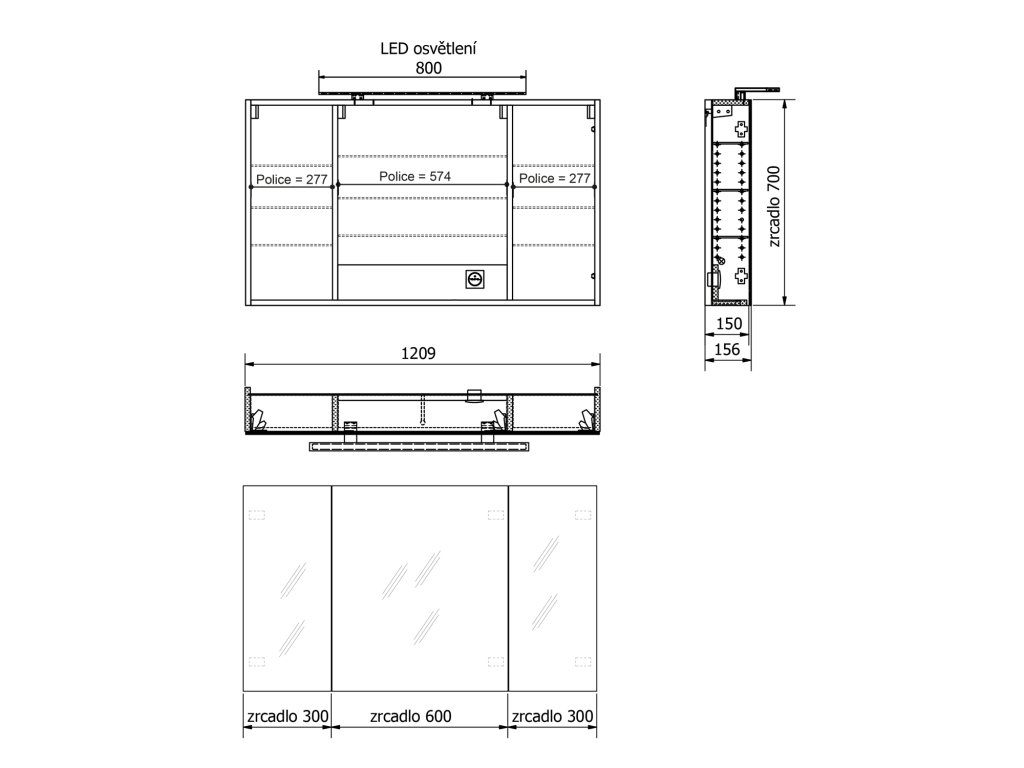 MIRRÓ galerka s LED osvětlením, 3x dvířka, 120x70x16cm, dub stříbrný