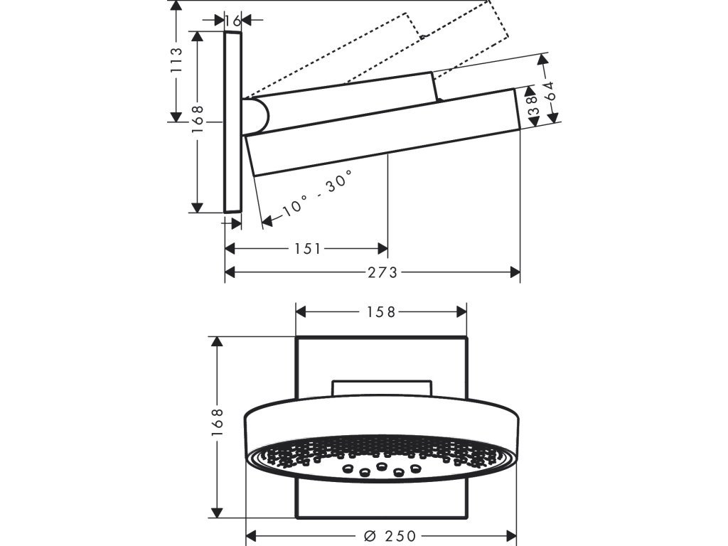 Velikost sprchového modulu je 250 mm, rameno sprchy vertikálně nastavitelné o 10-30°, druh proudu PowderRain, Intense PowderRain, RainStream