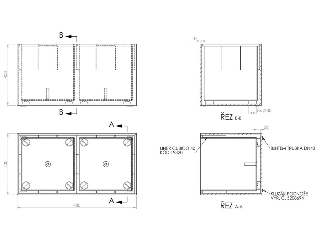 Obdélníkový květináč: délka 40 cm, šířka 120 cm, výška 40 cm