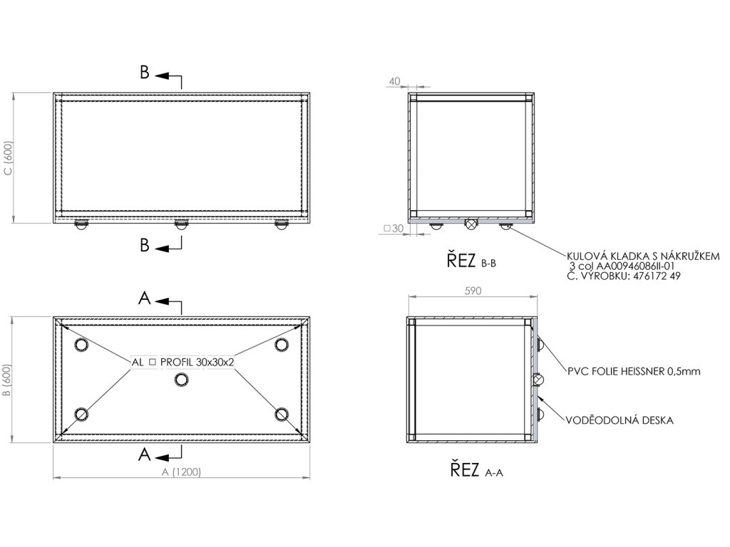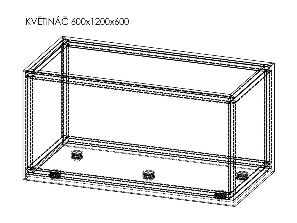 Obdélníkový květináč: délka 120 cm, šířka 60 cm, výška 60 cm