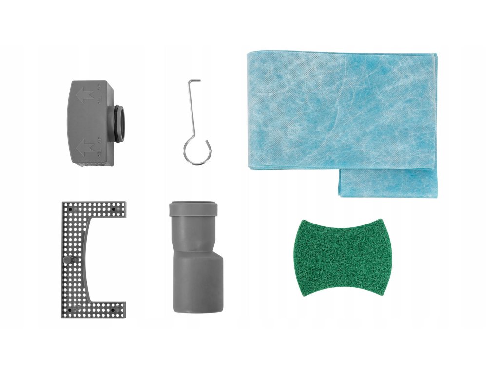 Sada obsahuje: žlab, kryt, nožičky, sifon, manžetu Dry-Fix, košík, manuál, háček na výměnu masky.