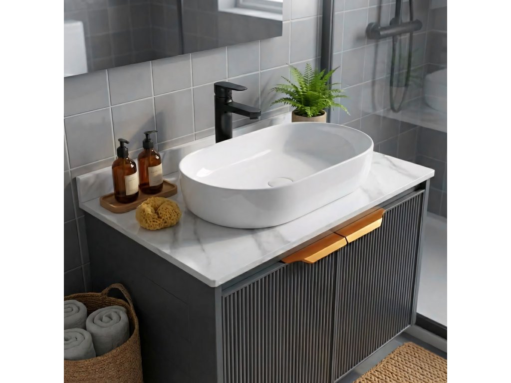 Koupelnová sestava Marti je hotové řešení určené pro montáž umyvadla na desku. Set se skládá ze závěsné spodní skříňky, pracovní desky a horní skříňky se zrcadlem. Celá sestava je postavena na lehké hliníkové konstrukci.Obsah sestavy – balení obsahuje spodní skříňku, desku s otvory a horní skříňku. Umyvadlo a baterie zobrazené na vizualizacích nejsou součástí setu (je nutné je dokoupit zvlášť).Materiál – korpusy a fronty jsou vyrobeny převážně z hliníku. Tento materiál je odolný vůči vlhkosti a vodní páře.Deska s otvory – spodní skříňka je kryta pevnou keramickou deskou. Má dva továrně vyříznuté otvory: jeden pro odpad umyvadla a druhý pro stojánkovou baterii, což usnadňuje instalaci.Rýhované čelo – dvířka pod deskou mají výrazný vlnitý povrch s vertikálními pruhy, který oživuje jednoduchý design.Zrcadlo s policemi – horní skříňka kombinuje zrcadlo s otevřeným regálem. Máš prostor pro ukrytí věcí za dvířky i police na kosmetiku, kterou chceš mít po ruce.Nástěnná montáž – nábytek je určen k zavěšení na stěnu.Sestava Marti je praktická volba, pokud hledáš hotové skříňky pro umyvadlo na desku. Díky keramické desce a hliníkové konstrukci je odolná a snadno se udržuje.