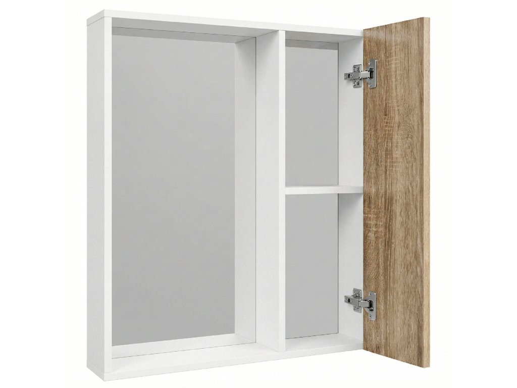 Horní skříňka s dvojitou zrcadlovou zónou – uvnitř skříňky je zrcadlo a po otevření dvířek získáte také další zrcadlovou plochu z vnitřní strany, což zvyšuje komfort při každodenním používání.