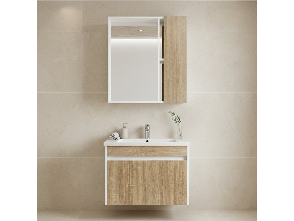 Sestava Faro 60 cm je praktická volba pro ty, kteří hledají kompletní řešení do koupelny. Kombinace MDF, keramického umyvadla a čel v dekoru dřeva vytváří estetický, funkční a každodenně pohodlný celek.