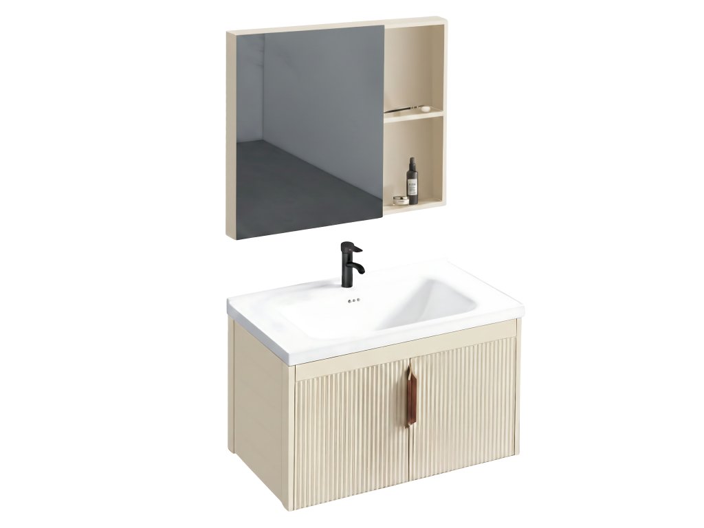 Sestava Astor je moderní závěsný nábytkový systém v béžové barvě. Spojuje minimalistický design s vysokou funkčností a nabízí hotové řešení pro umyvadlovou zónu.Skříňka pod umyvadlo – závěsný modul s elegantními béžovými čely s vertikálním rýhováním. Zajišťuje pohodlné ukládání při zachování moderní estetiky.Keramické umyvadlo – odolná bílá zapuštěná mísa, ideálně přizpůsobená skříňce. Má standardní otvor pro stojánkovou baterii.Skříňka se zrcadlem – funkční prvek s dalšími policemi na kosmetiku, který pomáhá optimálně využít prostor nad umyvadlem.Materiály a konstrukce – vyrobeno z hliníku a plastu, což zajišťuje odolnost proti vlhkosti a snadnou údržbu.Nástěnná montáž – závěsná konstrukce usnadňuje úklid koupelny a dodává interiéru vizuální lehkost.Sestava Astor je ideální volbou pro moderní interiéry. Kombinace teplého béžového odstínu a rýhované struktury čel vytváří stylový a uklizený vzhled koupelny.