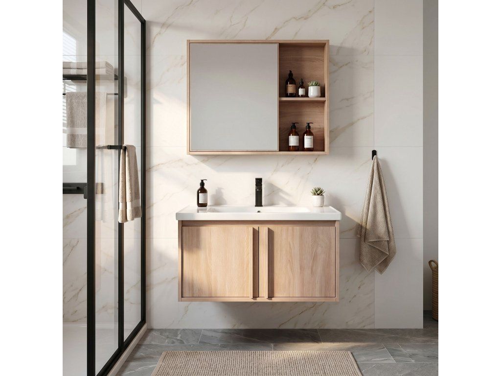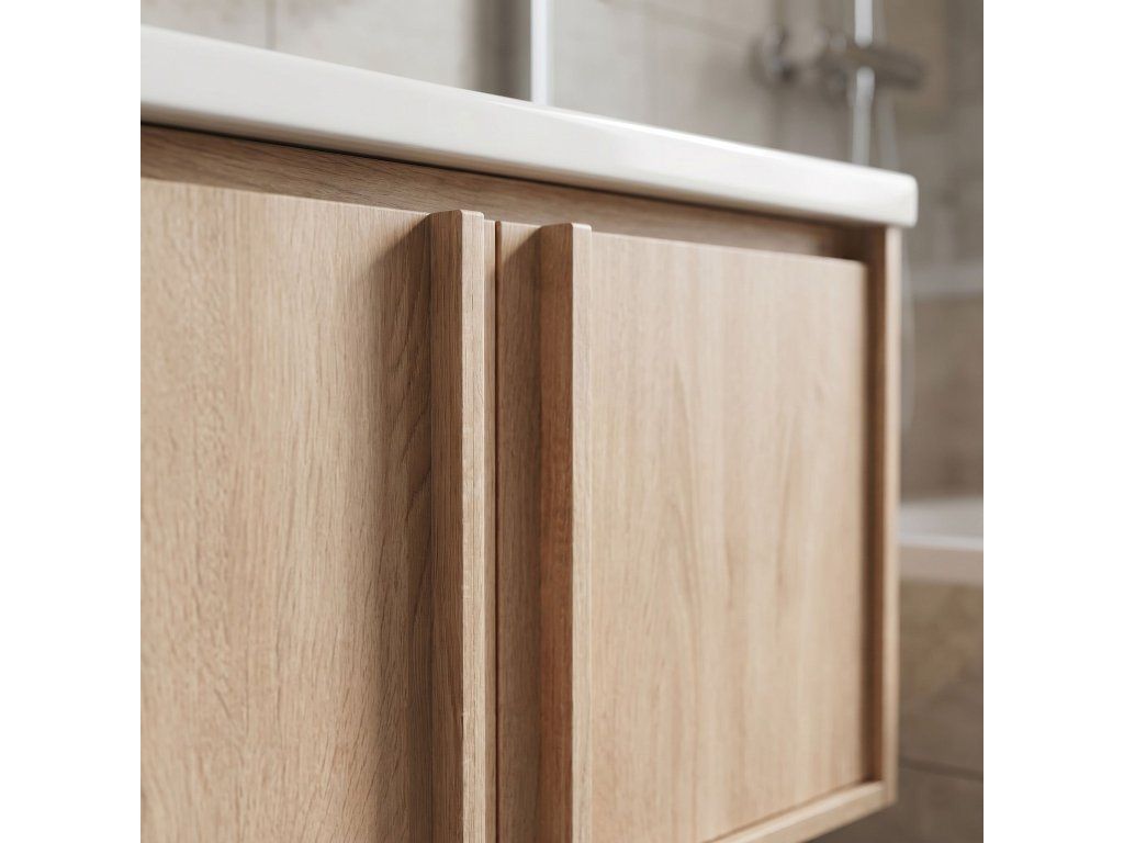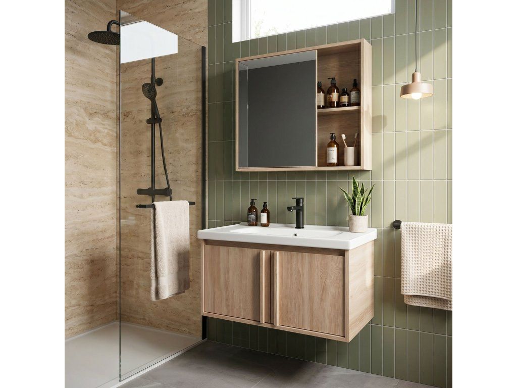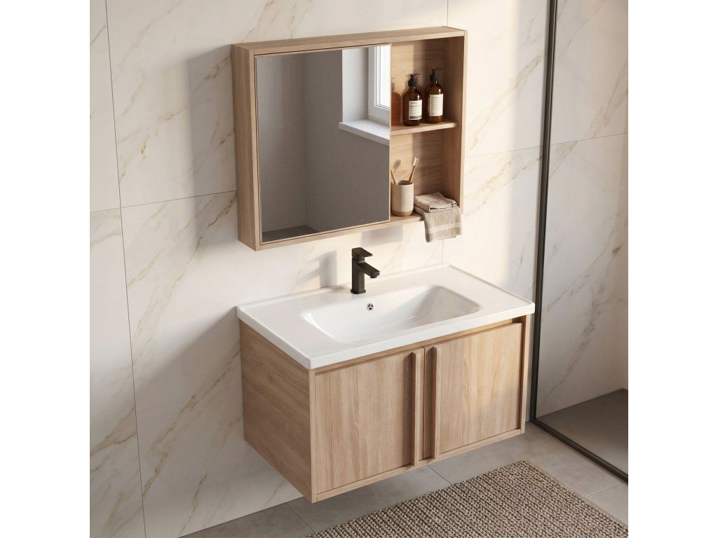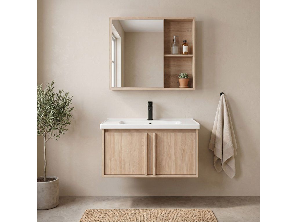 Sada koupelnového nábytku Gama je komplexní řešení, které umožňuje ucelené a funkční uspořádání koupelny. Sestava byla navržena s ohledem na maximální využití dostupného prostoru a spojuje jednoduchý tvar s velkým množstvím úložného prostoru.Závěsná umyvadlová skříňka – konstrukce montovaná na stěnu usnadňuje úklid koupelny a dodává interiéru lehkost. Díky výrobě z odolného plastu je nábytek lehký, stabilní a zcela necitlivý vůči vodní páře nebo stříkancům.Keramické umyvadlo – součástí sady je sladěné bílé umyvadlo s otvorem pro baterii a přepadem. Hladký povrch keramiky zajišťuje snadné čištění a je odolný proti poškrábání a chemikáliím.Zrcadlová skříňka s policemi – funkční nástěnný modul, do kterého se za zrcadlovou plochu vejdou nezbytné pomůcky. Další otevřené boční police umožňují pohodlné uložení věcí, které se vždy vyplatí mít po ruce.Plast imitující dřevo – použitý materiál věrně odráží strukturu a barvy přírodního dřeva.Jednoduchá montáž a funkčnost – sada Gama je hotové řešení do každé koupelny, kde záleží na jednoduchém tvaru, snadném udržování čistoty a dlouhodobé životnosti materiálů.Výběrem sady nábytku Gama získáte hotové integrované vybavení, které uspořádaně organizuje každodenní prostor a zajišťuje pohodlí a úhledný vzhled koupelny.