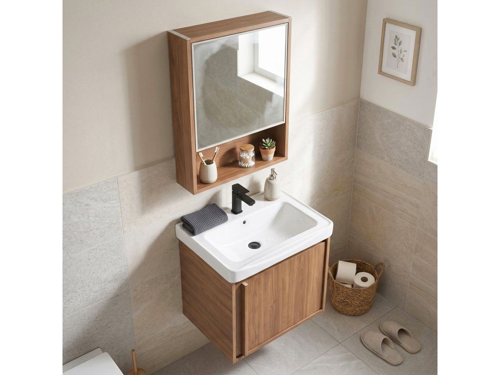 Sada koupelnového nábytku Gama je komplexní řešení, které umožňuje ucelené a funkční uspořádání koupelny. Sestava byla navržena s ohledem na maximální využití dostupného prostoru a spojuje jednoduchý tvar s velkým množstvím úložného prostoru.Závěsná umyvadlová skříňka – konstrukce montovaná na stěnu usnadňuje úklid koupelny a dodává interiéru lehkost. Díky výrobě z odolného plastu je nábytek lehký, stabilní a zcela necitlivý vůči vodní páře nebo stříkancům.Keramické umyvadlo – součástí sady je sladěné bílé umyvadlo s otvorem pro baterii a přepadem. Hladký povrch keramiky zajišťuje snadné čištění a je odolný proti poškrábání a chemikáliím.Zrcadlová skříňka s policí – funkční nástěnný modul, do kterého se za zrcadlovou plochu vejdou nezbytné pomůcky. Další otevřená police umožňuje pohodlné uložení věcí, které se vždy vyplatí mít po ruce.Plast imitující dřevo – použitý materiál věrně odráží strukturu a barvy přírodního dřeva. Jednoduchá linie a přírodní barvy dělají ze sady Gama vhodný prvek do většiny moderních uspořádání, tvořící praktický základ koupelnového vybavení.Jednoduchá montáž a funkčnost – sada Gama je hotové řešení do každé koupelny, kde záleží na jednoduchém tvaru, snadném udržování čistoty a dlouhodobé životnosti materiálů.Výběrem sady nábytku Gama získáte hotové integrované vybavení, které uspořádaně organizuje každodenní prostor a zajišťuje pohodlí a úhledný vzhled koupelny.