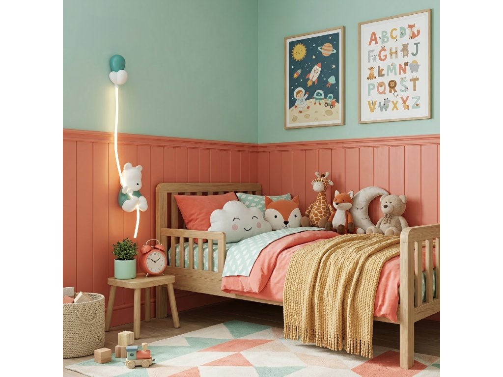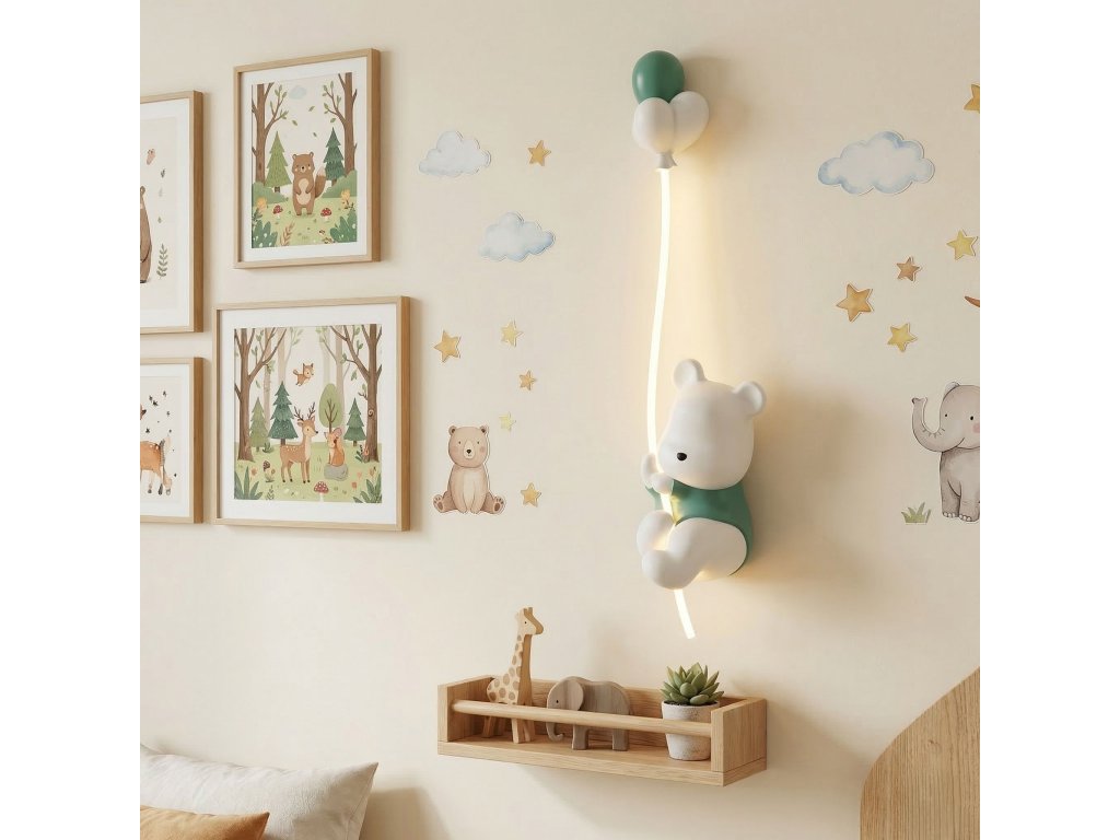 LED nástěnné svítidlo s medvídkem a balónky je dekorativní osvětlení navržené pro dětský pokoj. Model se skládá z horního uchycení ve tvaru balónků a medvídka umístěného na kulatém silikonovém LED pásku, což lampě dodává pohádkový a poutavý charakter.