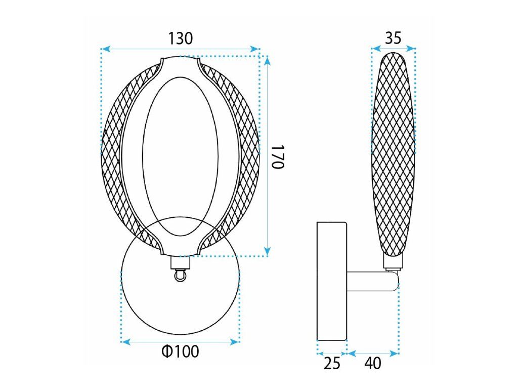 Montážní prvek na stěnu je vyroben z kovu, což zajišťuje odolnost konstrukce a pečlivou povrchovou úpravu. Světelná část je vyrobena z plastu, který jemně rozptyluje světlo a vytváří v interiéru příjemný, náladový efekt. Ozdobný zlatý detail umístěný uvnitř oválného tvaru podtrhuje elegantní styl lampy a dodává jí decentně luxusní charakter.