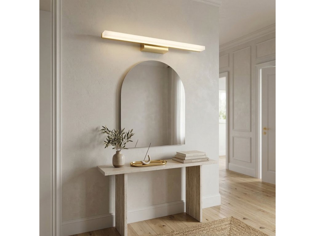 Moderní nástěnné LED svítidlo 13W s minimalistickým podlouhlým tvarem je elegantní volbou do koupelny, předsíně, ložnice nebo nad zrcadlo. Štíhlá konstrukce ve zlatém provedení v kombinaci s mléčným stínidlem zajišťuje estetický vzhled a rovnoměrně rozptýlené světlo. Jde o funkční svítidlo, které dokonale zapadá do moderních a jemně luxusních interiérů.