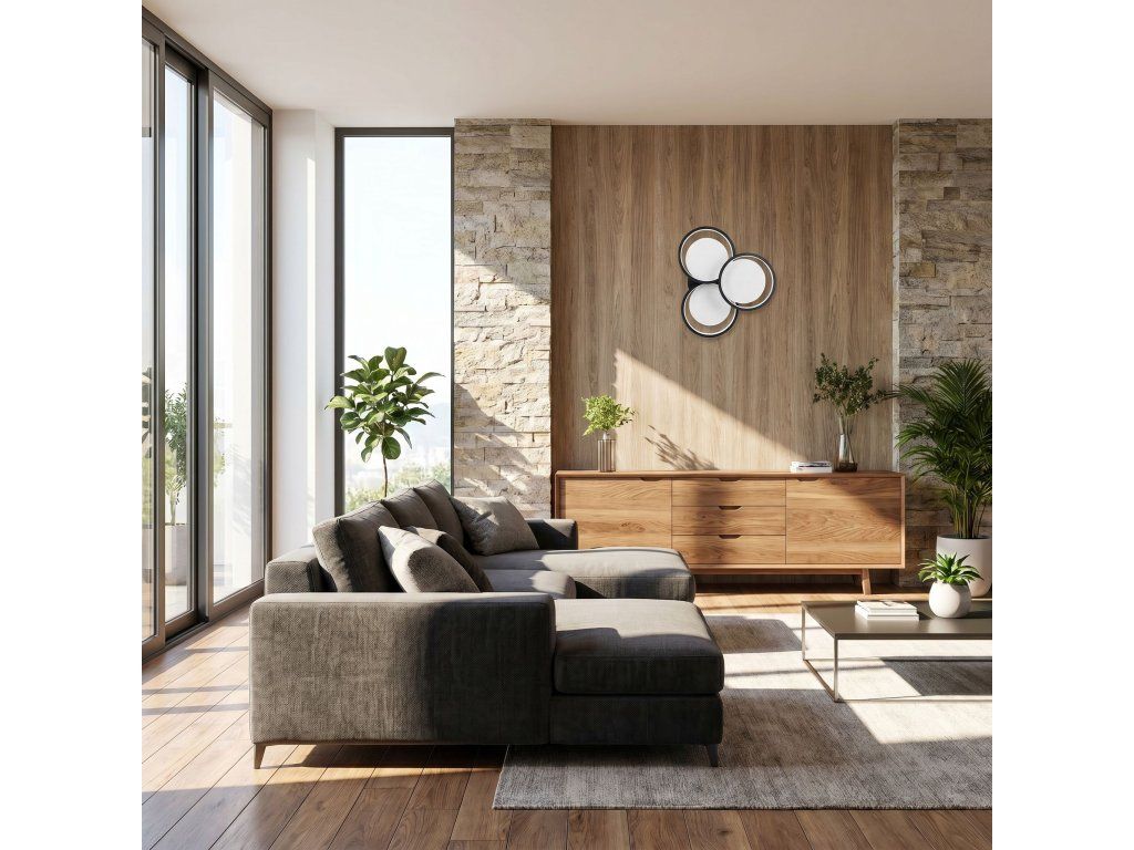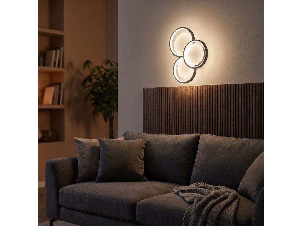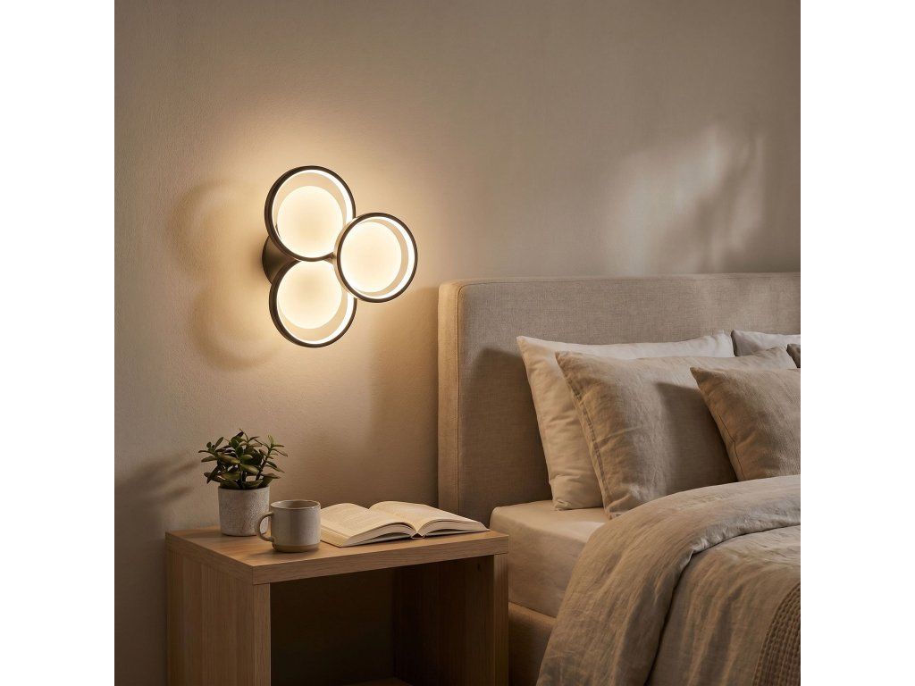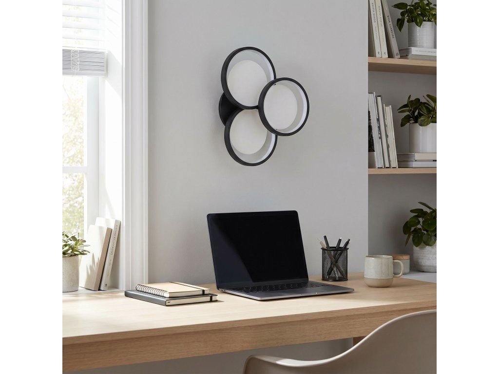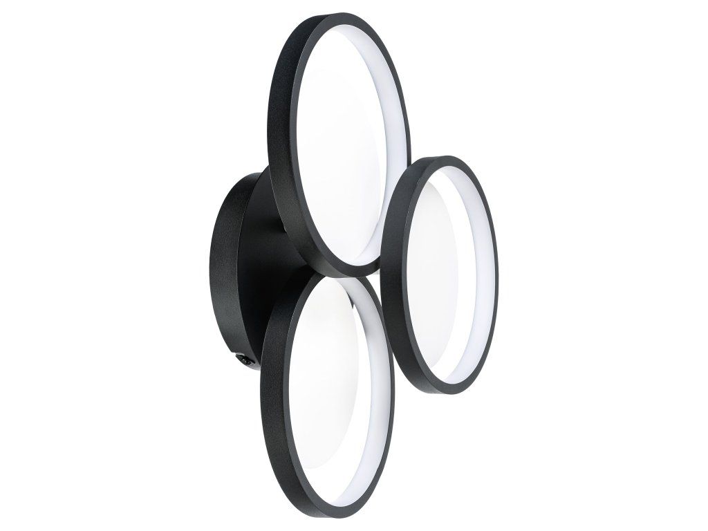 Nástěnné svítidlo moderního kompaktního tvaru je stylovou nabídkou pro minimalistické a moderní interiéry. Kompozice tří kruhů vytváří ucelené, dekorativní uspořádání, které přitahuje pozornost a dodává aranžmá geometrický charakter. Černé barevné provedení zdůrazňuje eleganci a díky němu model dokonale zapadá do současných trendů v interiérovém designu.