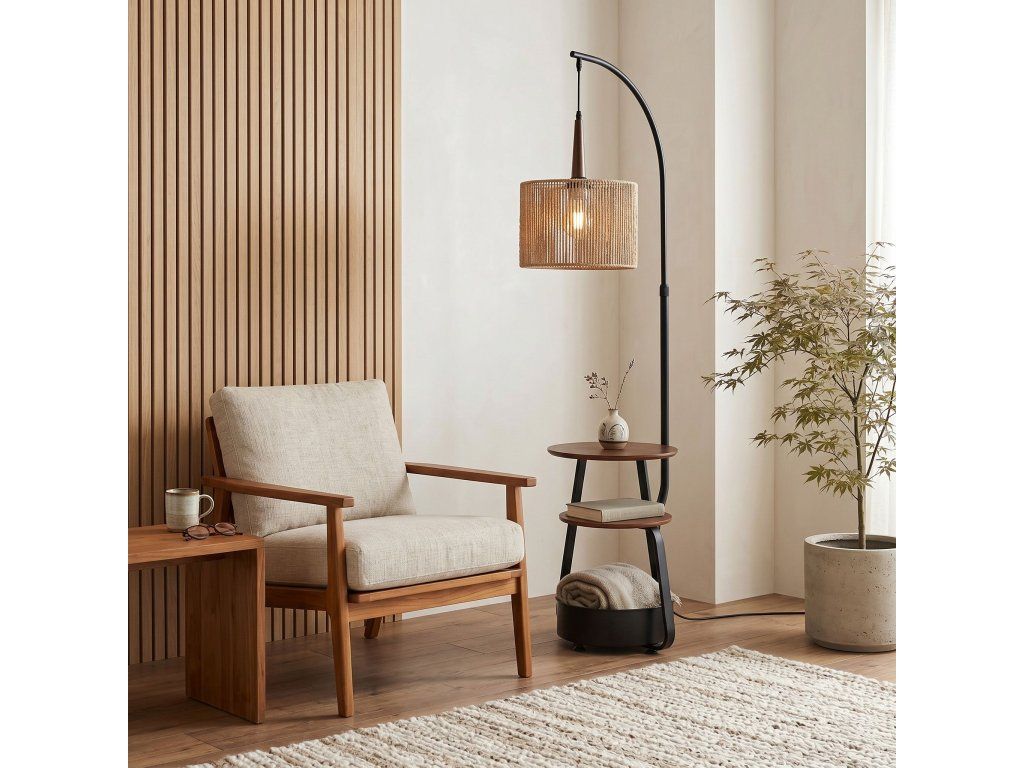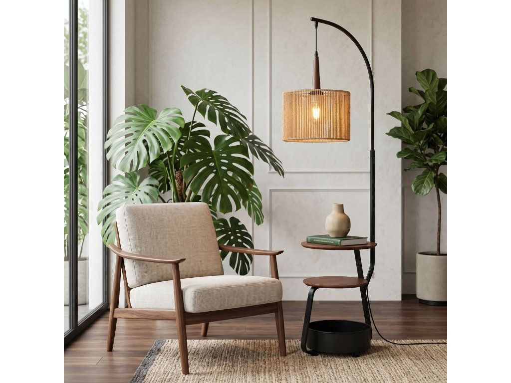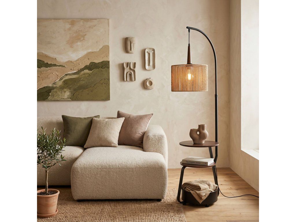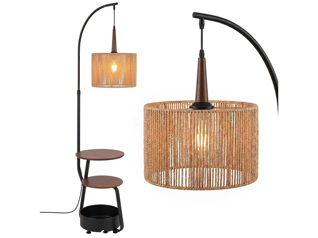 Jedná se o stylovou stojací lampu, která kombinuje kovovou konstrukci, přírodní jutové stínidlo a funkční police, a tvoří tak praktický a estetický doplněk moderních interiérů.
