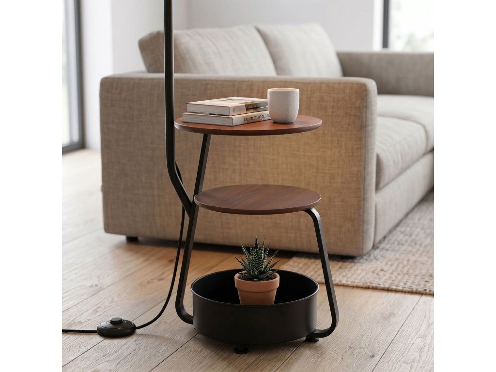 Model je vybaven dvěma funkčními policemi z MDF a přídavným spodním kontejnerem, který rozšiřuje možnosti úložného prostoru. Toto praktické řešení umožňuje využít lampu nejen jako zdroj světla, ale také jako užitkový prvek pro uložení drobností.