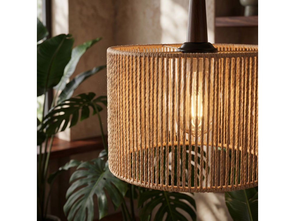 Konstrukce lampy je vyrobena z kovu v barvě Black, což zajišťuje stabilitu a odolnost. Stínidlo je vyrobeno z jutového provázku, který jemně propouští světlo a vytváří v interiéru hřejivou a atmosférickou atmosféru.