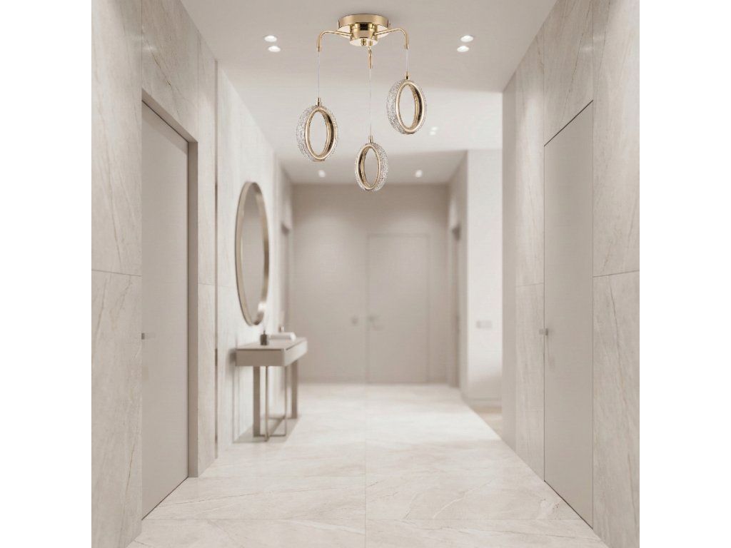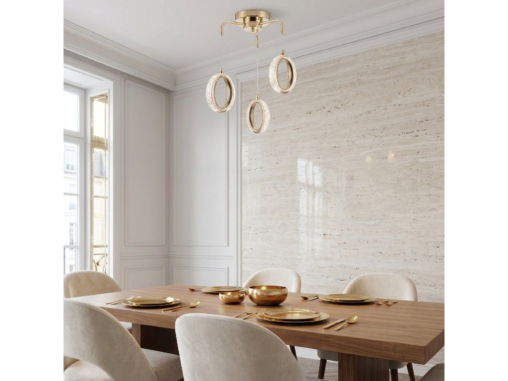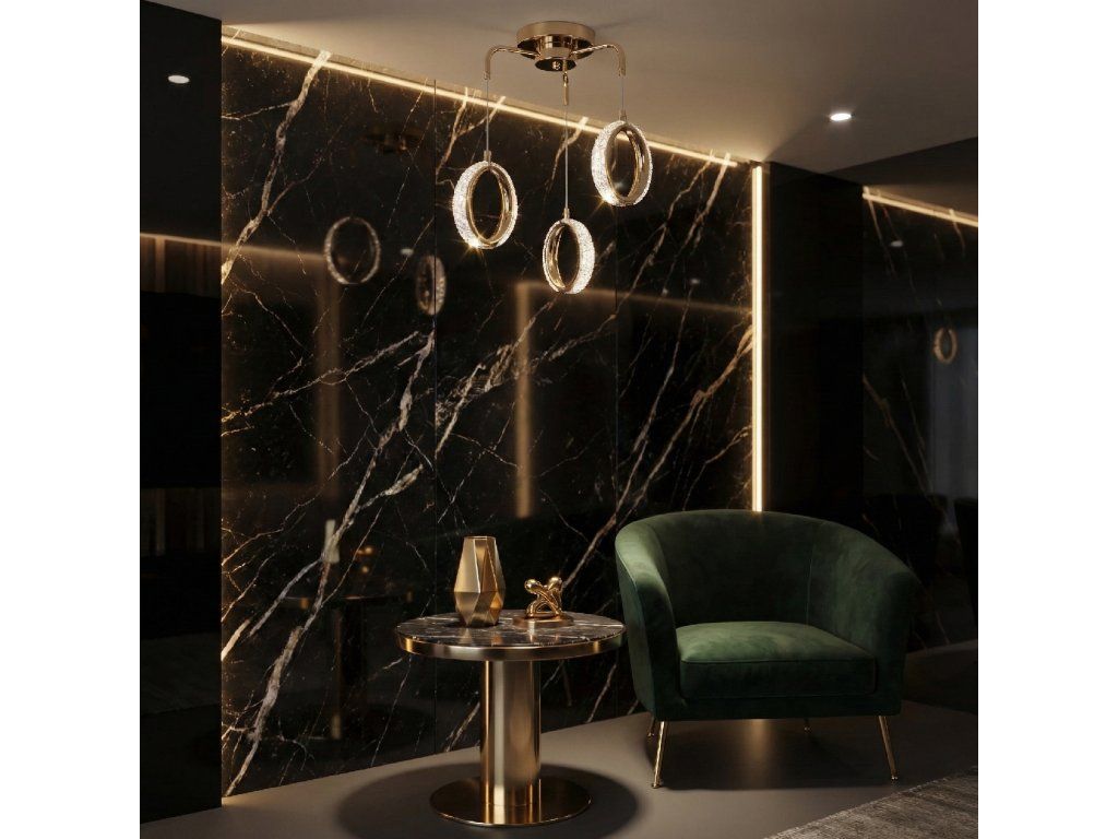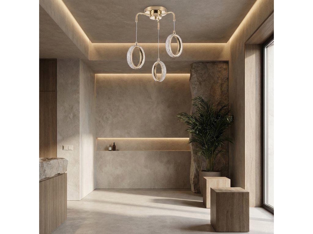 Tato výjimečná LED lampa je ideální volbou pro milovníky moderního designu s výrazným, elegantním glamour akcentem. Tři efektní světelné moduly ve tvaru zlatých kruhů vytvářejí prostorovou, dynamickou kompozici, která přitahuje pozornost a dodává interiéru jedinečnou atmosféru.
