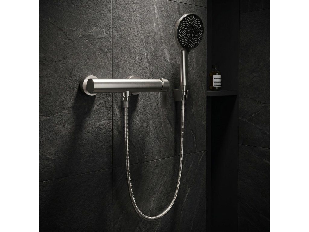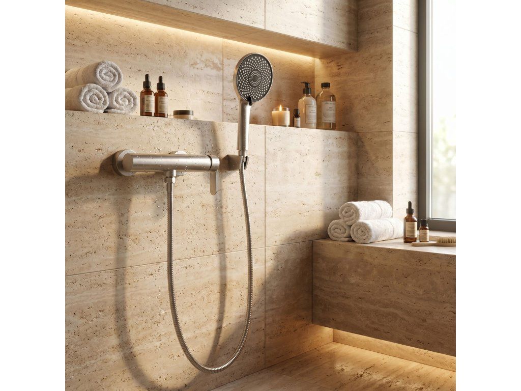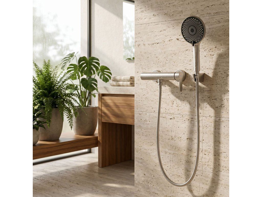Vanová baterie Rea Arcos v provedení Kartáčovaný nikl (Brushed Nickel) je nabídkou pro ty, kteří hledají střídmý, moderní design a nekompromisní odolnost materiálů. Chladný, saténový odstín niklu představuje elegantní alternativu ke klasickému chromu a vnáší do koupelny atmosféru klidu. Model Arcos vyniká minimalistickou válcovou formou vyrobenou z vysoce kvalitní nerezové oceli.Odolné tělo z nerezové oceli – použití nerezové oceli jako základního materiálu zaručuje nejvyšší odolnost proti mechanickému poškození, vysokému tlaku a korozi. Je to základ trvanlivosti, který zajišťuje hygienu a spolehlivost po celá desetiletí.Ušlechtilý povrch Kartáčovaný nikl – matný, kartáčovaný povrch dodává armatuře luxusní metalický vzhled. Je mimořádně praktický, protože účinně maskuje skvrny, vodní kámen i otisky prstů.Technologie PVD – pokročilá metoda nanášení barev ve vakuu zajišťuje, že niklový povrch je extrémně tvrdý a trvale spojený s ocelovým podkladem. To zaručuje odolnost proti poškrábání a čistícím prostředkům.Inovativní výtok s funkcí přepínače – inteligentní konstrukce, kde pohyblivý výtok slouží zároveň ke změně zdroje vody. Nastavení výtoku kolmo k tělu otevře vanový výtok, zatímco jeho sklopení podél baterie automaticky přesměruje proud do sprchové hlavice.Moderní sprchová hlavice – sada obsahuje plochou hlavici s geometrickým uspořádáním trysek, která zajišťuje komfortní koupel i oplachování.Přesná keramická kartuše – použití vysoce kvalitní keramické vložky umožňuje plynulou a přesnou regulaci teploty a síly proudu vody při zachování těsnosti.Sjednocený design – baterie je vybavena barevně sladěným držákem sprchy, což umožňuje vytvořit estetickou koupelovou zónu bez zbytečných montážních prvků.Rea Arcos Kartáčovaný nikl redefinuje ergonomii v koupelně. Díky použití nerezové oceli a technologie PVD jde o produkt pro nejnáročnější interiéry. Čistá forma bez vyčnívajícího přepínače dělá z každé koupele potěšení.