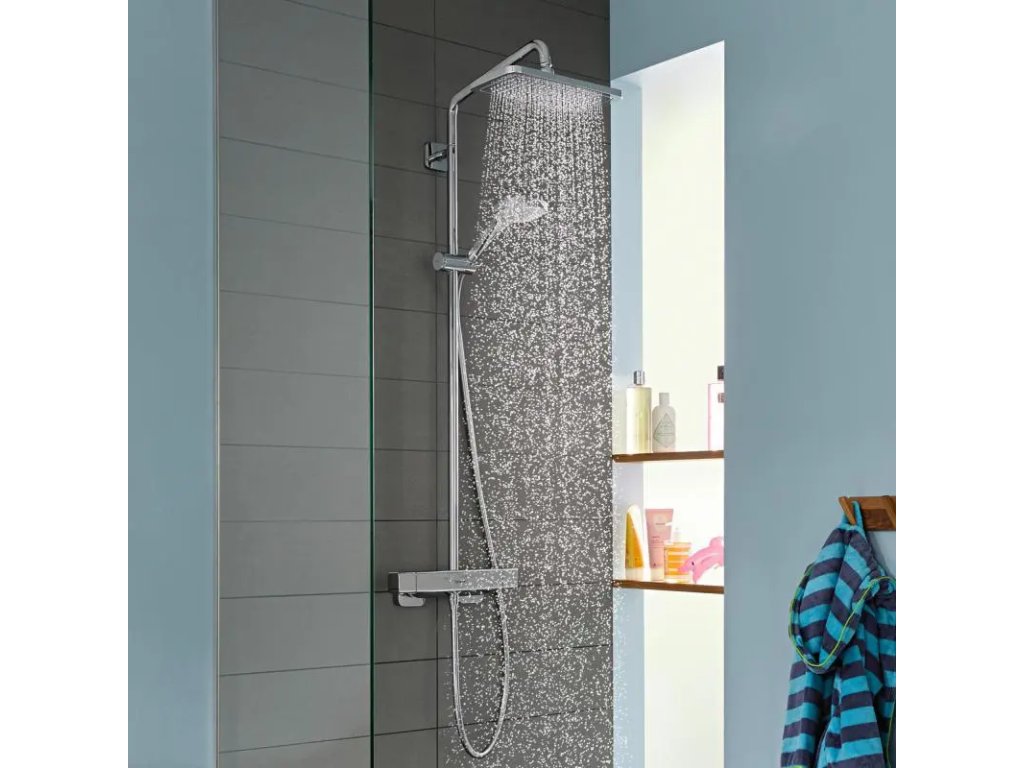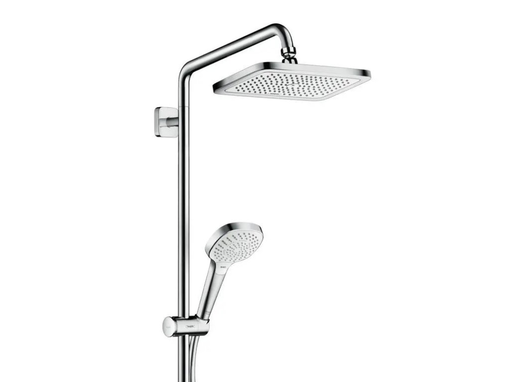 Sprchový set Showerpipe obsahuje: horní sprchu Croma E s jedním druhem proudu, nástěnnou termostatickou sprchovou baterii, ruční sprchu Croma Select E se třemi druhy proudu, sprchovou hadici Isiflex