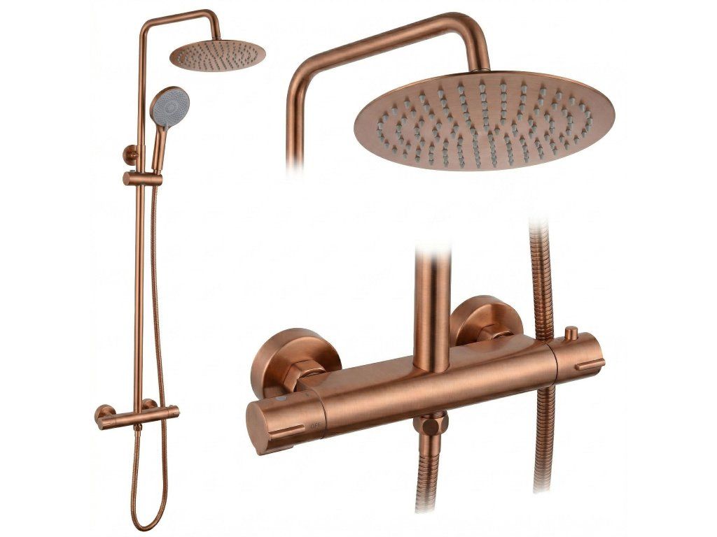 Sprchová sada Lungo s termostatem v povrchové úpravě Kartáčovaná měď (Brushed Copper) je jedinečnou nabídkou pro ty, kteří hledají armaturu s neotřelým a teplým charakterem. Hladká, minimalistická forma v kombinaci s luxusním odstínem mědi činí z této sady hlavní dekorativní prvek koupelny, který se ideálně hodí do loftového, moderního i retro stylu. Díky použití pokročilé technologie nanášení povlaku PVD armatura zaujme hloubkou barvy a dlouholetou odolností.Termostatická baterie – zaručuje konstantní teplotu vody po celou dobu koupání, což zajišťuje maximální komfort, bezpečnost a ochranu před náhlými změnami teploty.Povrchová úprava Kartáčovaná měď – ušlechtilý matný povrch s hlubokým měděným odstínem, který je velmi praktický – účinně maskuje skvrny od vody a otisky prstů.Technologia PVD – vakuová metoda nanášení povlaku zajišťuje extrémní odolnost barvy a nejvyšší rezistenci vůči poškrábání a vnějším vlivům.Minimalistický design Lungo – čisté, válcové linie bez zbytečných ozdob zdůrazňují moderní šmrnc sprchové zóny a usnadňują údržbu.Kompletní sprchový systém – sada obsahuje velkou, štíhlou dešťovou sprchu a ergonomickou ruční sprchu, nabízející relaxační proud vody přizpůsobený vašim potřebám.Konstrukce bez výtoku – sada určená pro sprchy působí lehce a zabírá optimálně málo místa, což umožňuje plnou svobodu pohybu při koupeli.Materiály třídy Premium – robustní mosazné tělo a vysoce kvalitní vnitřní komponenty zaručují bezporuchový provoz a plnou těsnost sady.
