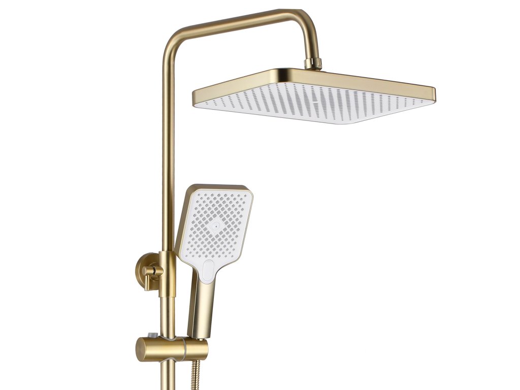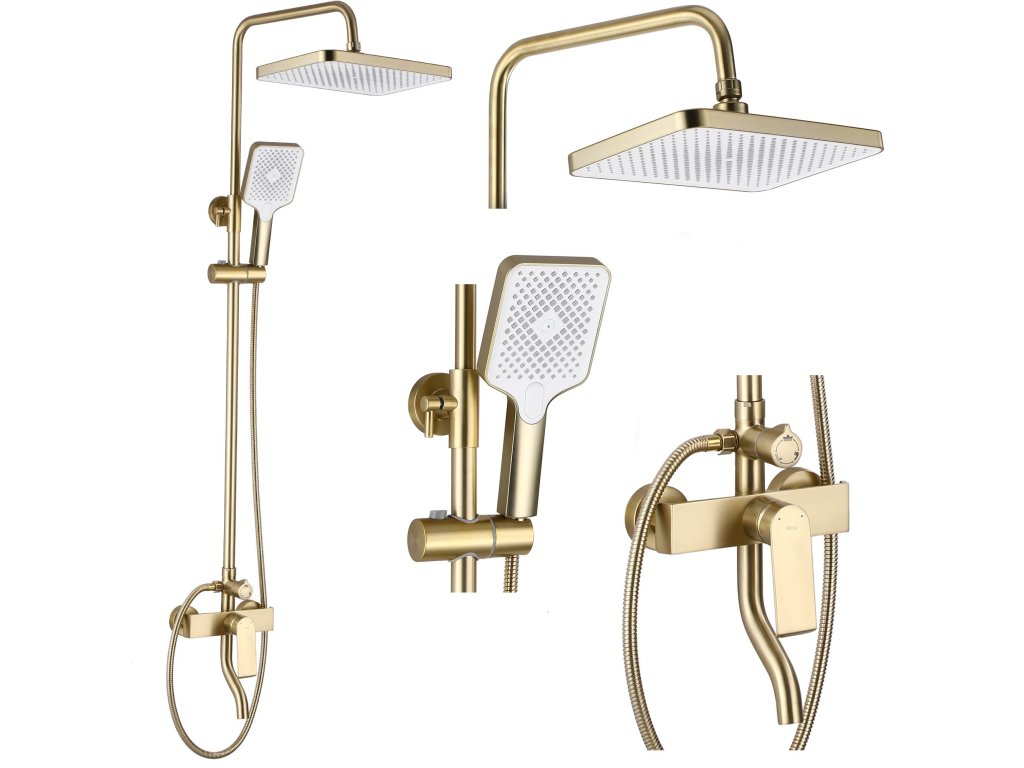 Moderní, designérská sprchová sada neobyčejných tvarů série Rea Hass obsahuje baterii, vyrobenou z mosazi vysoké kvality v provedení, snoubícím honosné broušené zlato a neutrální bezbarvé prvky. Lakování baterie bylo provedeno ve třech vrstvách, díky čemuž je baterie odolná vůči korozi a ztrátě barvy. Další dílčí prvky jsou vyrobeny z prvotřídních materiálů odolných vůči poškození.