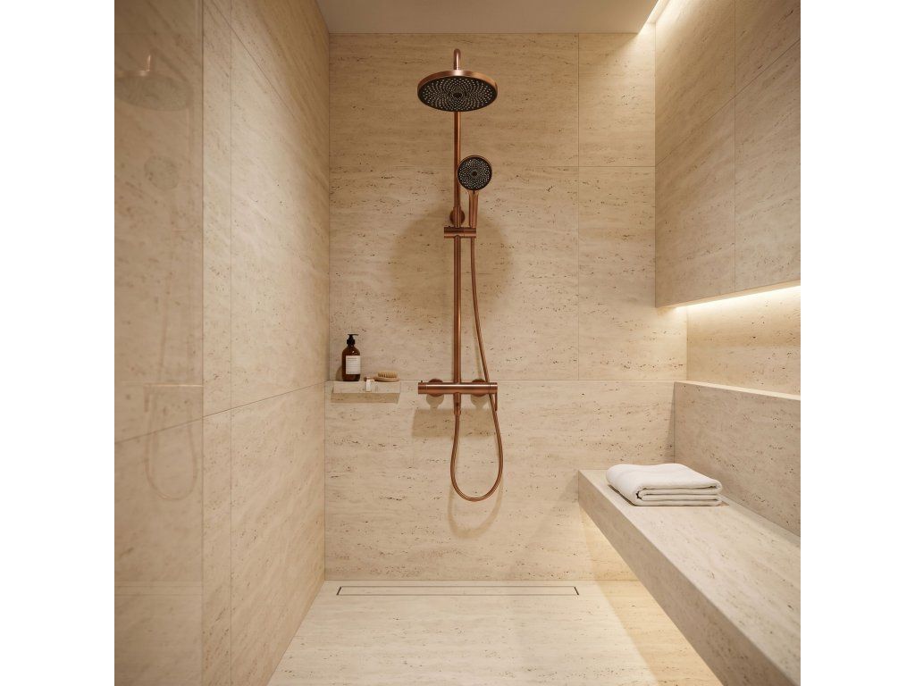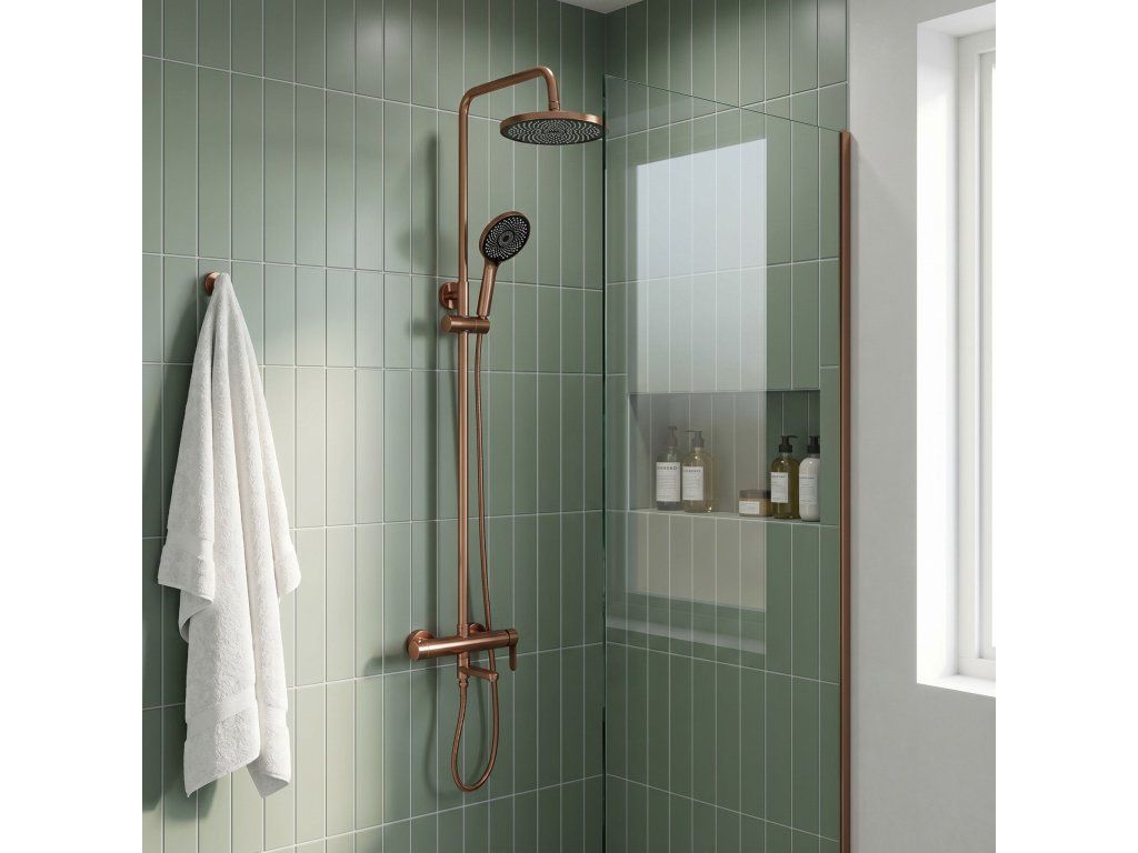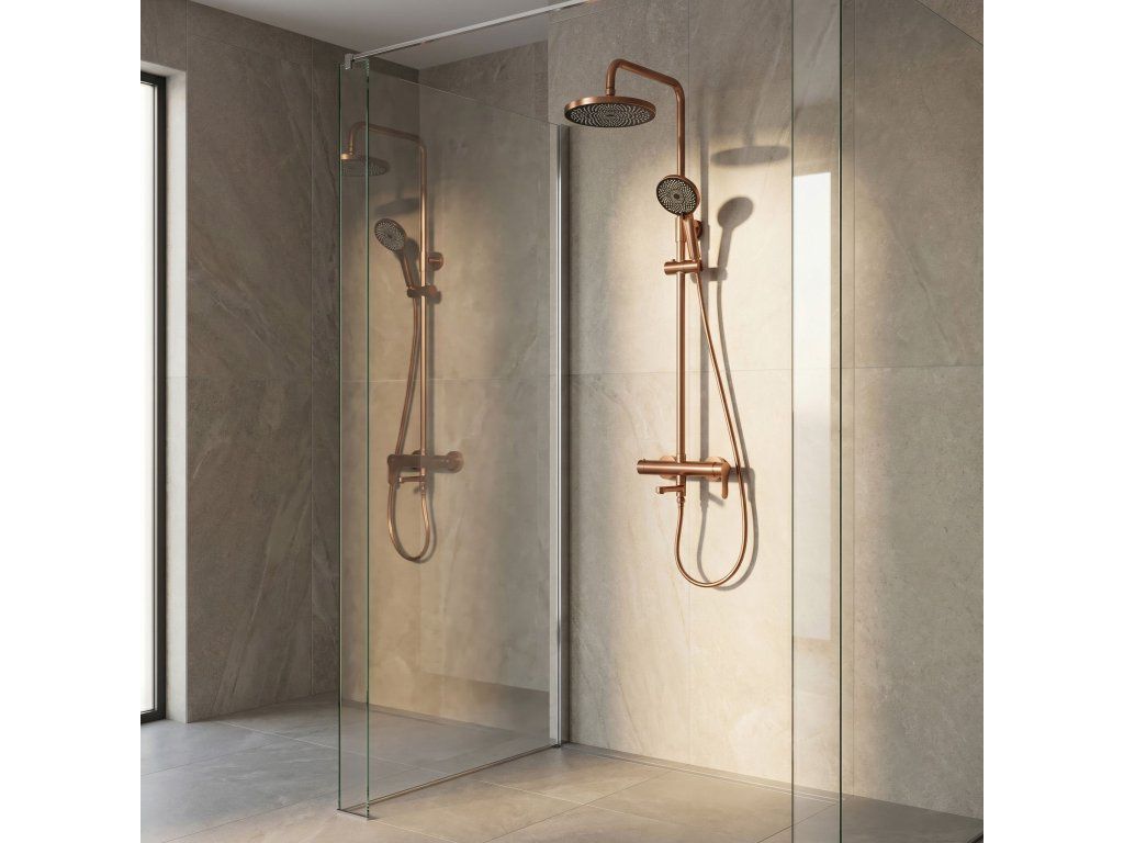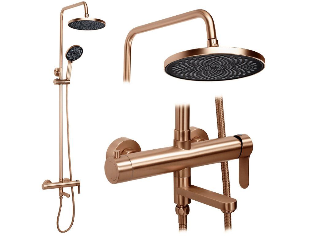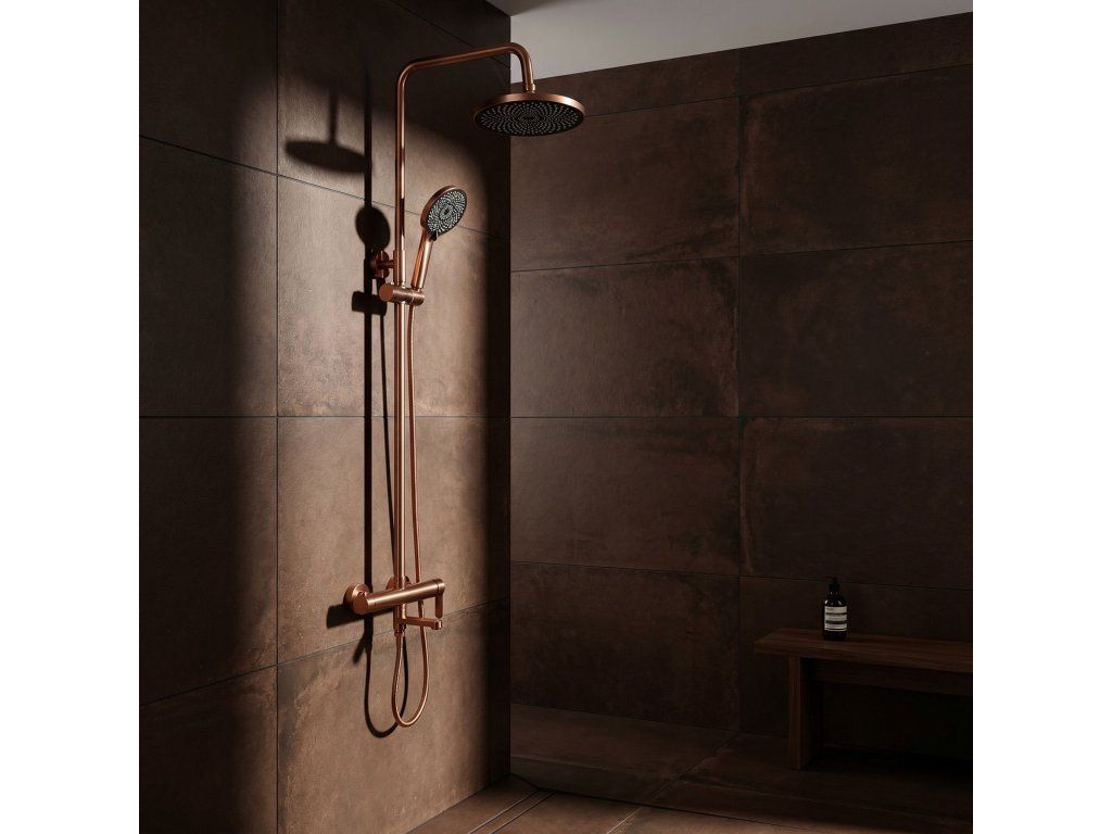 Sprchová sada Rea Arcos v provedení kartáčovaná měď (Brushed Copper) je nabídkou pro milovníky teplých, metalických barev a neotřelého designu. Tento unikátní odstín vnáší do koupelny útulnou atmosféru v luxusním vydání a dokonale ladí s betonem, kamenem či přírodním dřevem. Sada Arcos spojuje robustní kovovou základnu s lehkými sprchovými prvky v dokonale vyvážený systém.Teplý lesk kartáčované mědi – matný, saténový povrch dodává armatuře šperkový charakter. Kartáčovaný povrch účinně maskuje skvrny od vody a otisky prstů.Odolný povrch PVD – měděná barva je nanášena vakuovou metodou, což zaručuje nejvyšší odolnost proti poškrábání a korozi. Technologie PVD zajišťuje barevnou stálost po mnoho let.Robustní základna z mosazi a oceli – tělo baterie a sprchový sloup jsou vyrobeny z vysoce kvalitních kovů, což zajišťuje stabilitu a odolnost proti tlakovým skokům.Funkční spodní výtok – přítomnost pevného výtoku v baterii je obrovskou výhodou, zejména při instalaci nad vanu. Umožňuje rychlé napuštění vody bez nutnosti spouštět sprchu.Lehká dešťová sprcha ABS – velká kulatá hlavice z kvalitního ABS plastu poskytuje široký, relaxační proud vody a nezatěžuje konstrukci tyče.Sprchová hlavice ABS s systémem Anti-Calc – ergonomická hlavice je vybavena silikonovými tryskami, které umožňují okamžité odstranění vodního kamene jedním pohybem ruky.Keramická kartuše Premium – špičkový keramický ventil umožňuje plynulou a přesnou kontrolu teploty a proudu vody.Nastavitelná výška – sloup je vybaven posuvným držákem hlavice, což umožňuje pohodlné přizpůsobení výšky všem uživatelům.Rea Arcos kartáčovaná měď PVD dokazuje, že pokročilá technologie může jít ruku v ruce s luxusním stylem. Ideální řešení pro moderní sprchové kouty i vany se zástěnou.