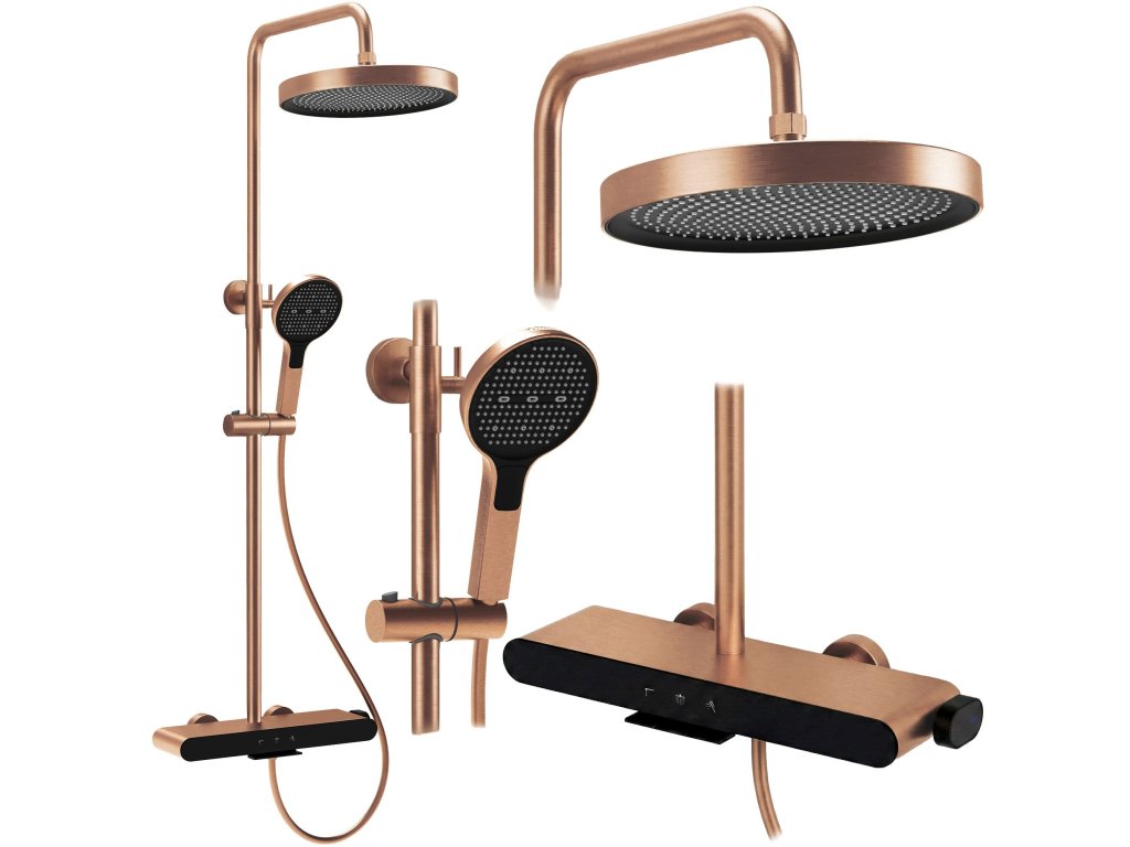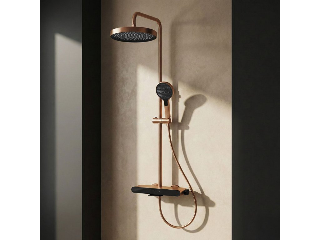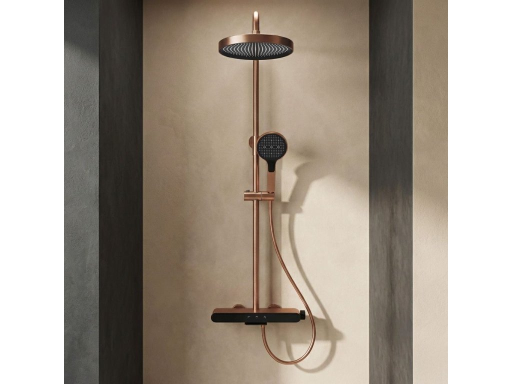 Dodejte své koupelně výjimečný, hřejivý charakter díky nástěnnému sprchovému setu Rea Farel Brush Copper. Tento model v provedení kartáčovaná měď je určen pro ty, kteří hledají alternativu ke zlatu a černé. Set kombinuje ušlechtilý kovový design s inovativní funkčností ovládání a udržování čistoty.Barva Brush Copper – elegantní měděný odstín s jemně kartáčovanou strukturou. Saténová povrchová úprava působí moderně a zároveň je praktická – na kartáčovaném povrchu jsou kapky vody a otisky prstů výrazně méně viditelné.PVD povlak – měděná barva byla nanesena technologií PVD (Physical Vapor Deposition). Jde o nejodolnější metodu barvení armatury, která zaručuje mimořádnou odolnost vůči poškrábání, zmatnění a korozi.Intuitivní panel Piano – baterie se ovládá pomocí tří mechanických tlačítek (kláves). Toto pohodlné řešení umožňuje bleskově přepínat proud vody mezi hlavovou sprchou, ruční sprchou a výtokem bez nutnosti otáčení ovladačů.Ruční sprcha s funkcí Bidetta – rukojeť sprchy skrývá další funkci. Má tlačítko na zadní straně a trysku na horní části těla. Po aktivaci se změní na bidetovou spršku, což usnadňuje čištění kabiny, mytí vaničky či napouštění vysokých misek.Diskrétní kaskádový výtok – tělo baterie je vybaveno širokým kaskádovým výtokem. Umožňuje rychlé naplnění kbelíku, misky nebo kontrolu teploty vody přímo u baterie.Materiály a regulace – srdcem setu je pevné tělo z mosazi. Hlavová i ruční sprcha z lehkého ABS mají systém proti usazování vodního kamene. Celek je upevněn na výškově nastavitelné tyči.Set Rea Farel Brushed Copper představuje spojení technologické přesnosti a jedinečného designu. Kartáčovaný měděný PVD povrch je výrazným akcentem interiéru a činí z něj jeden z nejodolnějších setů na trhu, připravený na každodenní používání.