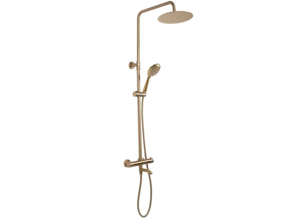 Moderní, designérská sprchová sada s neobyčejnými tvary série Rea Lungo obsahuje termostatickou baterii, vyrobenou z mosazi vysoké kvality v honosném zlatoskvoucím provedení. Lakování baterie bylo provedeno ve třech vrstvách, díky čemuž je baterie odolná vůči korozi a ztrátě barvy. Další dílčí prvky jsou vyrobeny z prvotřídních materiálů odolných vůči poškození.