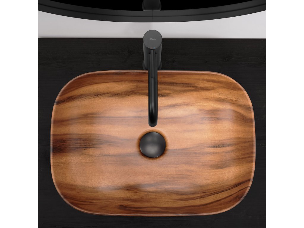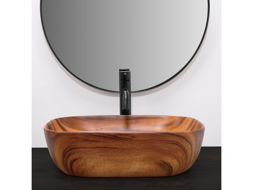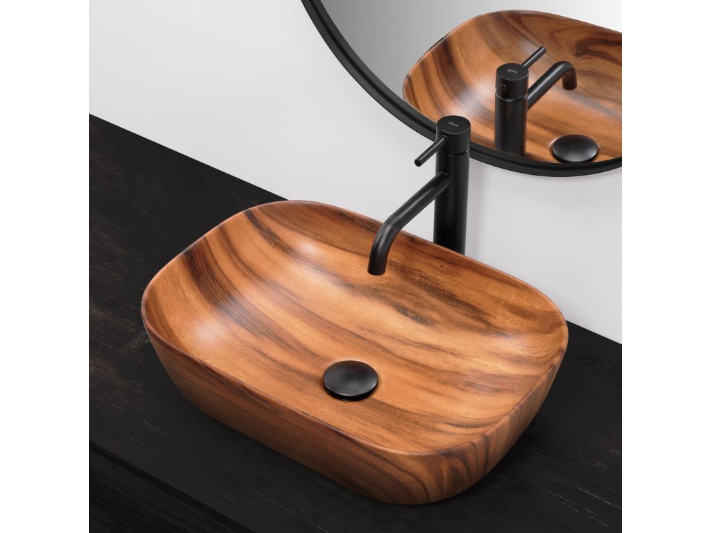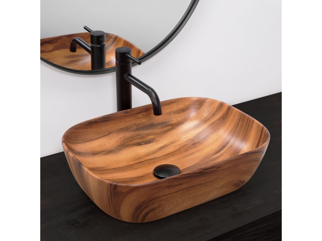 Umyvadlo v provedení, které napodobuje dřevo, se navíc díky speciální fázi výroby snadno čistí a je velice odolné.