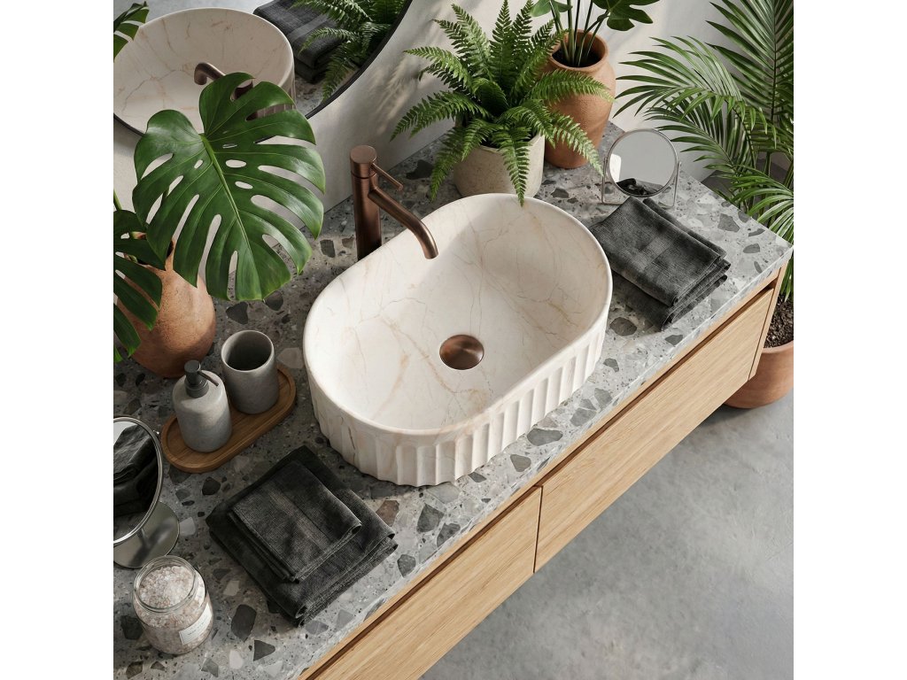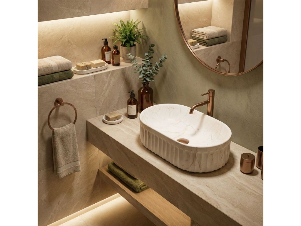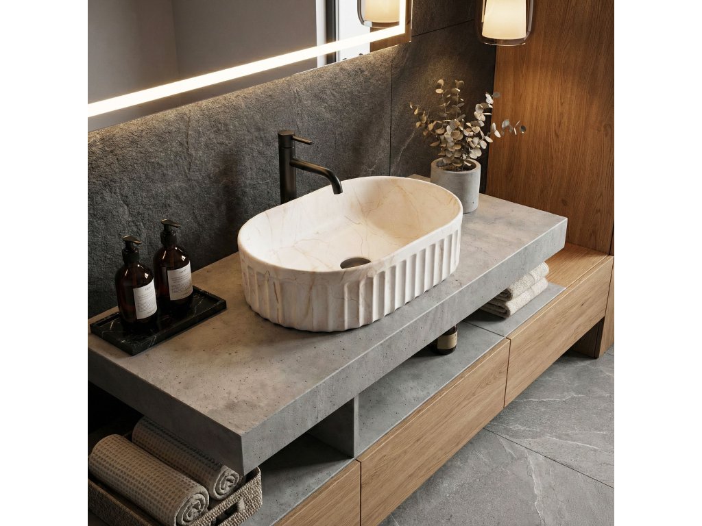 Objevte jedinečný design a funkčnost díky umyvadlu na desku Georgia. Tento model spojuje osvědčenou, odolnou keramiku s nejnovějšími interiérovými trendy. Vyniká charakteristickou rýhovanou strukturou vnější části a jemným matným povrchem se vzorem kamene, který dodá umývací zóně moderní a výrazný charakter.Rýhovaná struktura – vnější povrch mísy má svislé drážky (rýhování). Jde o velmi trendy detail, který narušuje hladké plochy, opticky odlehčuje tvar a skvěle ladí s dalšími rýhovanými prvky v koupelně, například s čely nábytku.Matný povrch s motivem kamene – umyvadlo zaujme vzorem imitujícím přírodní mramor s jemným rezavým žilkováním. Matný povrch je nejen estetický, ale i praktický pro každodenní používání.Odolná sanitární keramika – model je vyroben z vysoce kvalitního materiálu, který se vyznačuje vysokou odolností proti poškrábání a poškození, což zaručuje stálý vzhled po dlouhá léta.Montáž na desku – umyvadlo je určeno k instalaci přímo na desku nebo skříňku. Toto řešení zvyšuje komfort používání a umožňuje získat další místo na kosmetiku kolem mísy.Ergonomický oválný tvar – oblý tvar bez ostrých hran usnadňuje odtok vody a každodenní čištění je rychlé a bezproblémové.Umyvadlo na desku Georgia je skvělou volbou pro ty, kteří hledají originální, ale praktické vybavení. Rýhovaný design a matný kamenný vzor tvoří harmonický celek, který bude výrazným prvkem každé moderní koupelny.