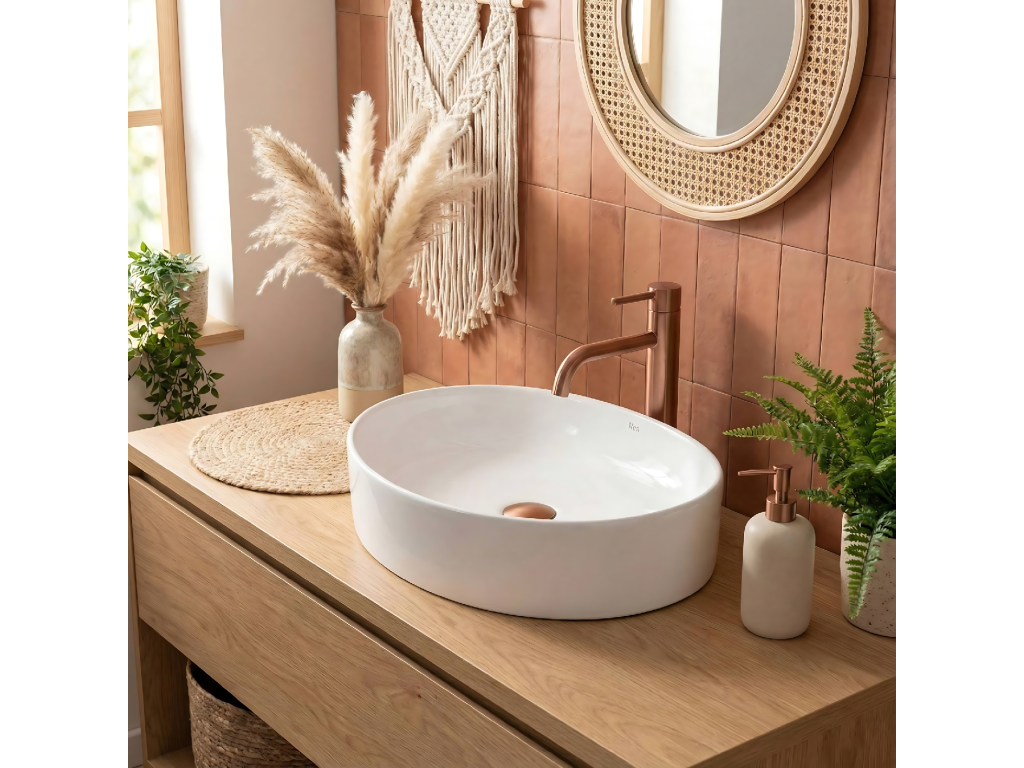 Oválný, mírně asymetrický tvar umyvadla mu nejen dodává lehkost, ale také zajišťuje pohodlné používání díky hluboké míse. Model Joana je určen k montáži na desku nebo koupelnovou skříňku, což umožňuje plné využití prostoru a přizpůsobení individuálním interiérovým uspořádáním.