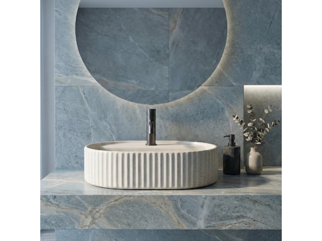 Umyvadlo na desku Rea Marcela 50 ve variantě Vanilla je ideální volbou do koupelen, kde záleží na propracovaném detailu a klidné, elegantní barevnosti. Teplý odstín lomené bílé prostor opticky odlehčí a přináší „jemný“ dojem čistoty, zároveň se skvěle kombinuje s kamennými deskami, dřevem i černými či grafitovými bateriemi. Díky tomu se hodí jak do moderních prémiových interiérů, tak do stylu soft loft nebo modern classic.Tvar zaujme výrazným svislým žebrováním na vnější stěně, které podtrhuje designový charakter a dělá z umyvadla dekorativní prvek. Další výhodou je decentní tečkovaná struktura viditelná na povrchu – dodává povrchu hloubku, přirozený „kamenný“ efekt a celkově velmi noblesní vzhled. Oválná, pohodlně tvarovaná mísa zajišťuje komfort při každodenním používání a matná povrchová úprava Vanilla pomáhá udržet jednotný, moderní vzhled umyvadlové zóny.