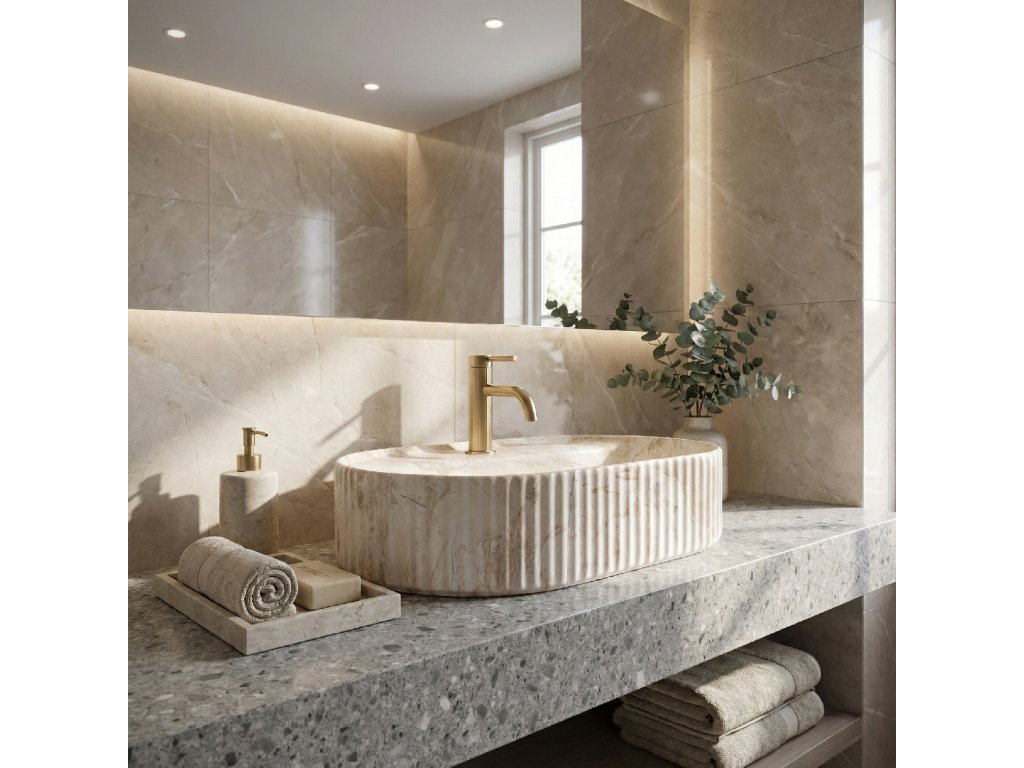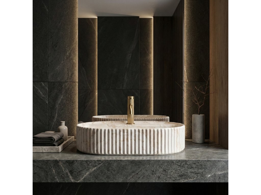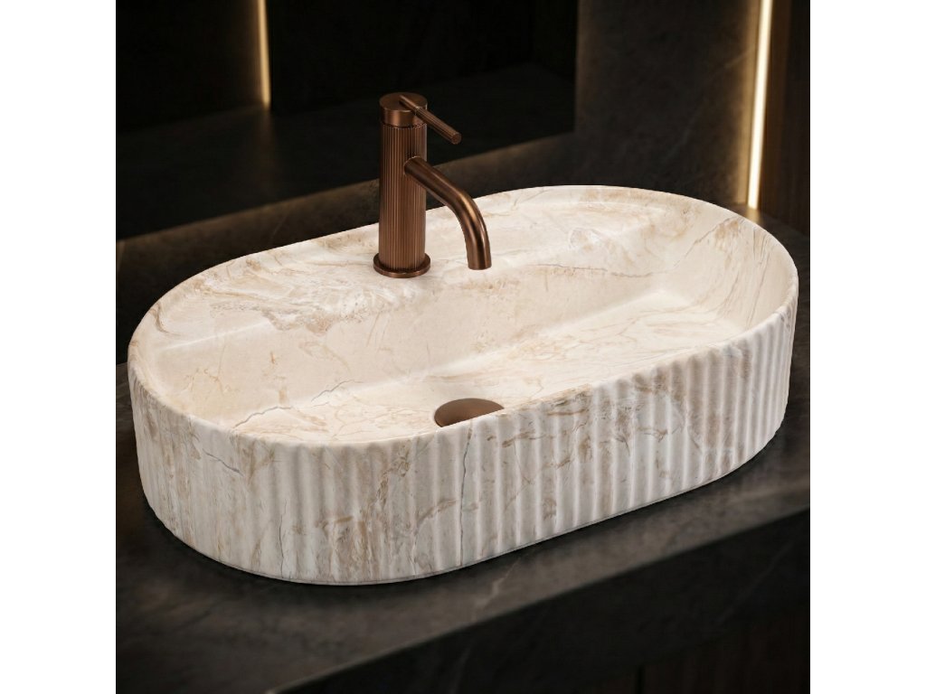 Umyvadlo na desku Rea Marcela 60 ve variantě Saturn je určeno pro ty, kteří oceňují výrazný design spojený s elegantní, tlumenou barevností. Jemně prodloužený oválný tvar působí lehce a moderně, dekorativní svislé rýhování na vnějších stěnách dodává architektonický charakter. Skvělé pro prémiové moderní koupelny, kde hraje roli tvar i detail.Povrch Saturn je inspirován přírodním kamenem – světlá, mramorová struktura s jemným žilkováním v teplých pískových tónech vytváří klidné, ale luxusní pozadí pro baterie v měděné, zlaté či černé barvě. Matná úprava působí elegantně na světlých i tmavých deskách. Komfortní hloubka zvyšuje pohodlí, profilované hrany omezují rozstřikování vody.