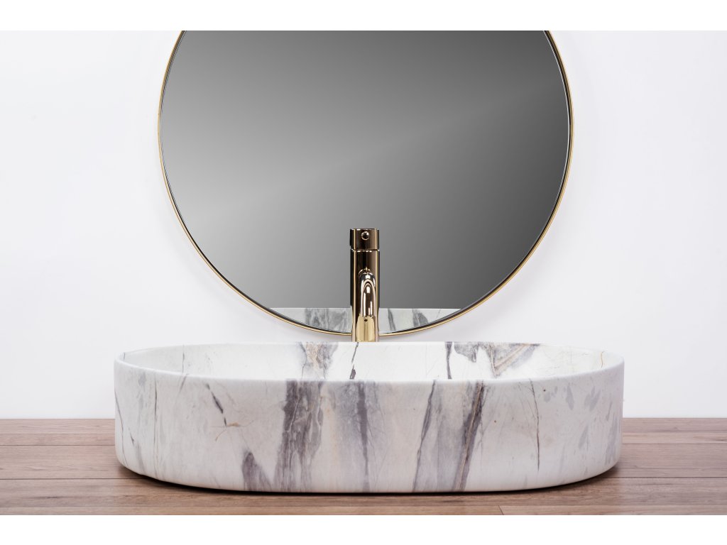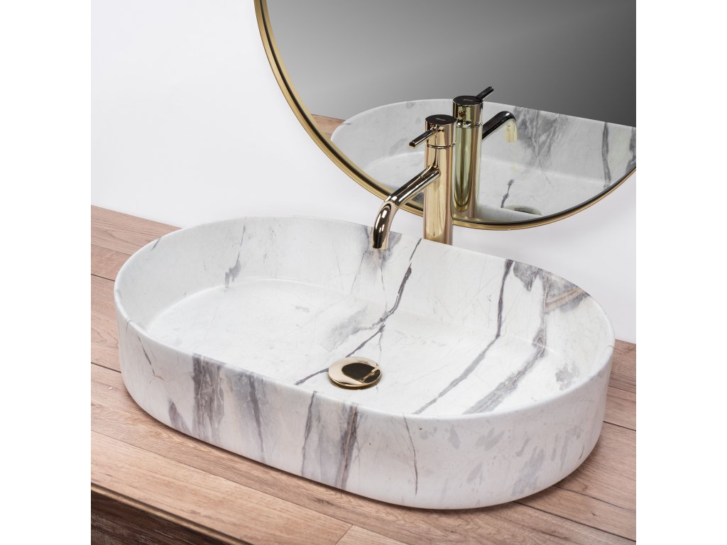 Umyvadlo v bílém lesklém provedení se vznešeným zlatým okrajem se navíc díky speciální fázi výroby snadno čistí a je velice odolné.