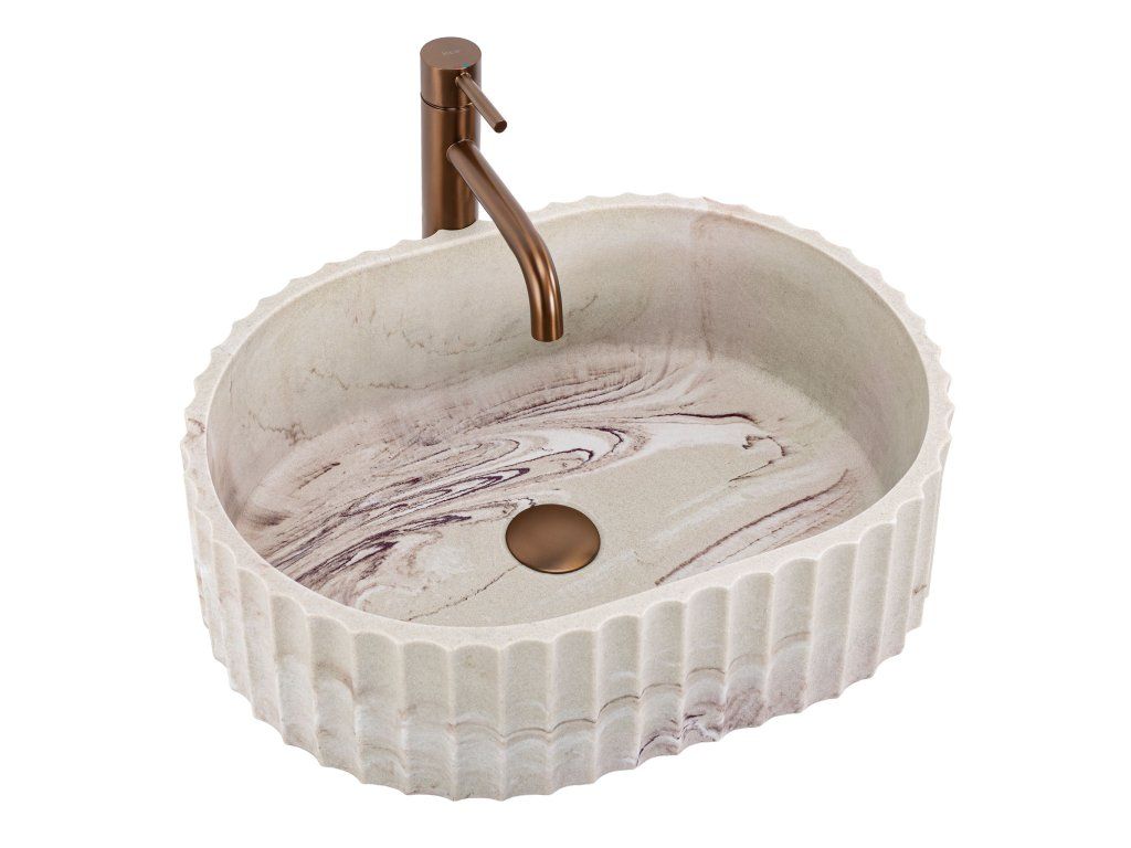 Ryflowaná struktura – vnější stěny zdobí pravidelné svislé rýhování, které dodává rytmus a sochařský charakter. Detail, který z umyvadla dělá dominantní prvek.