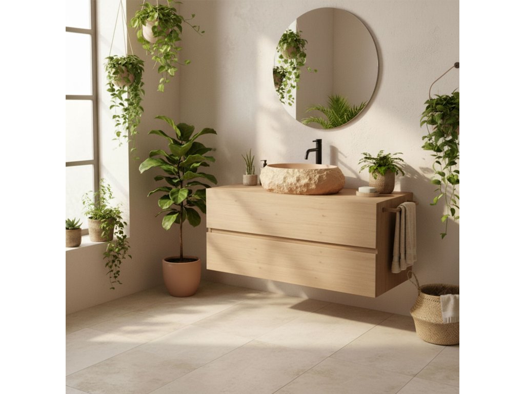 Nábytkové umyvadlo Mika je nabídka pro ty, kteří chtějí ve své koupelně spojit eleganci s moderností. Jeho povrch zaujme hlubokou kamennou strukturou, která interiéru dodává jedinečný charakter.