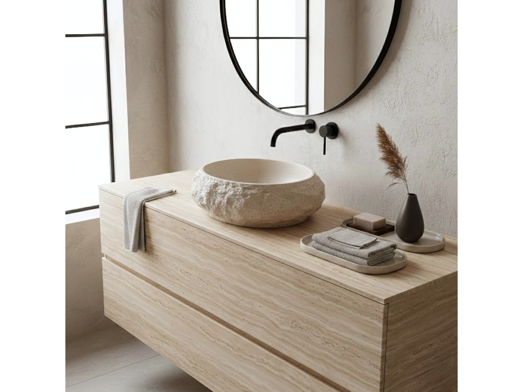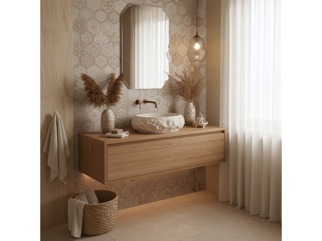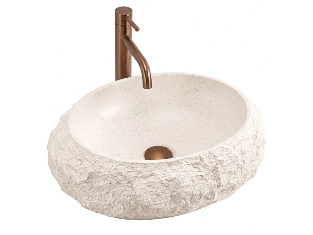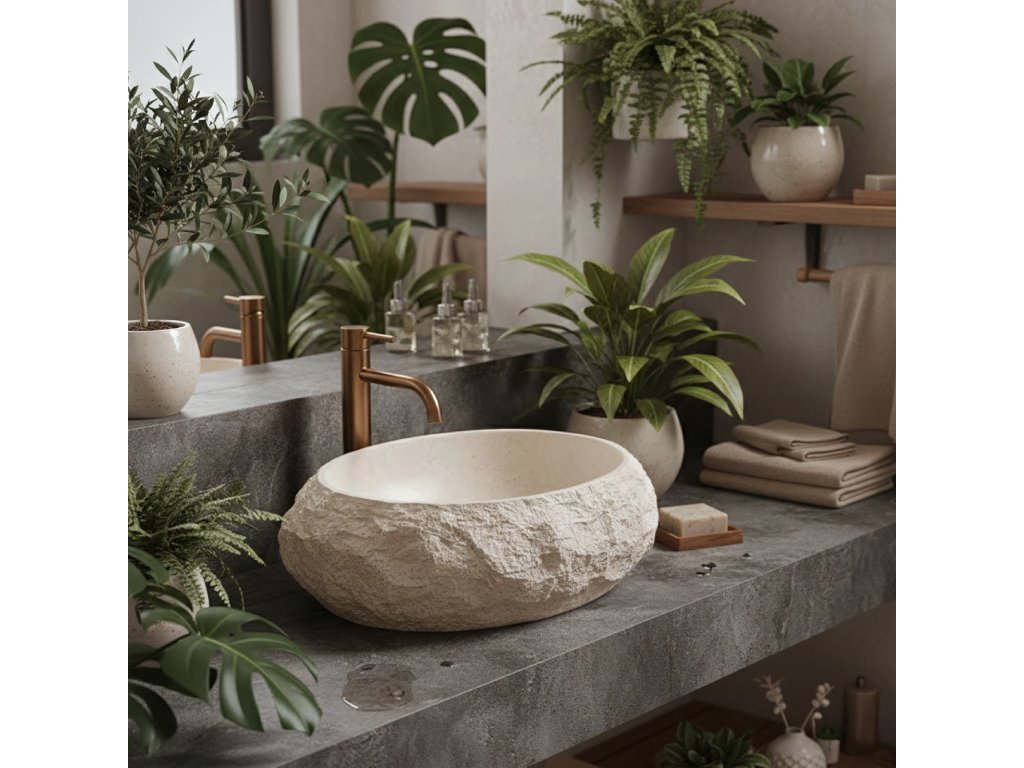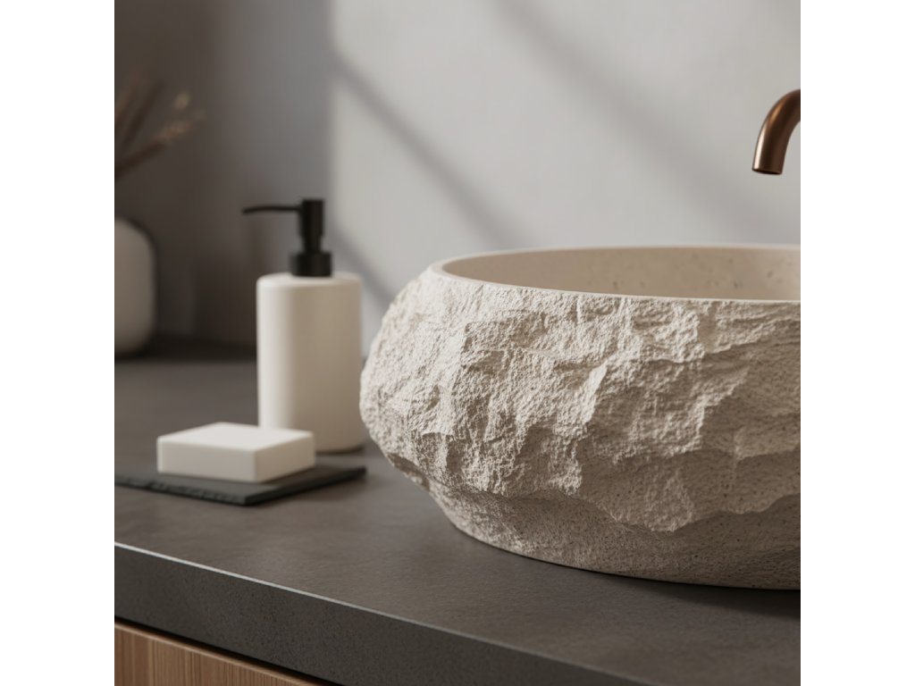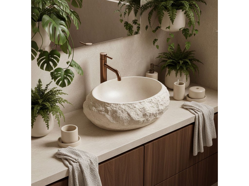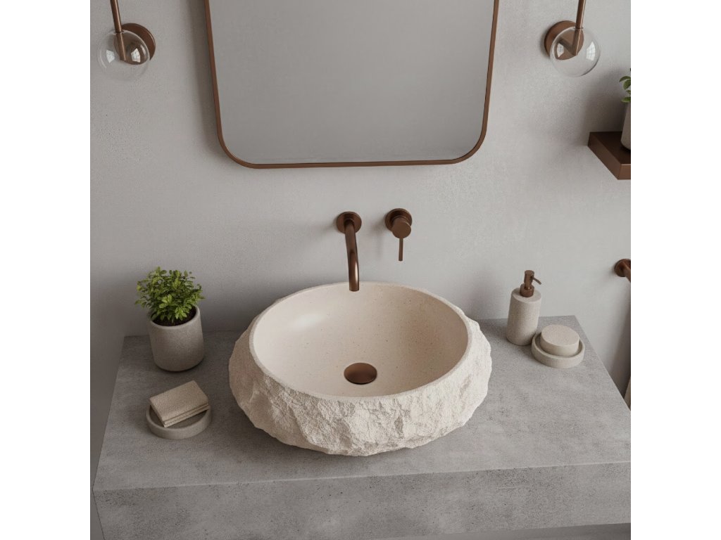 Vneste do interiéru teplo a harmonii výběrem umyvadla na desku Rea Mika Warm Beige. Tento model vyniká přirozenou barevností v zemitých odstínech a jedinečnou strukturou. Vnější, surový povrch vytváří působivý kontrast s dokonale hladkým vnitřkem mísy. Celek je vyroben z inovativního kompozitu Artificial Stone, který spojuje estetiku kamene s vysokou odolností.Odstín Warm Beige – umyvadlo je laděno do útulné tonality teplé, světle béžové. Tato uklidňující barva odkazuje na odstíny přírodního pískovce a navozuje v koupelně atmosféru domácího spa.Vlastnosti kompozitu – materiál Artificial Stone zaručuje výjimečnou pevnost a odolnost proti poškození a zároveň je na dotek teplejší než tradiční keramika.Funkční vnitřek – vnitřní část mísy je hladce vyleštěná, což zajišťuje volný odtok vody a snadnou údržbu, i přes drsnou vnější strukturu.Trvanlivost na roky – použitý kompozit je odolný vůči vlhkosti, vysokým teplotám i odštěpkům a dlouhodobě si zachovává bezchybný vzhled.Montáž na desku – konstrukce přizpůsobená instalaci na desku nebo skříňku umožňuje naplno vyniknout dekorativnímu charakteru tvaru.Umyvadlo Rea Mika Warm Beige je ideální volbou do aranžmá ve stylu boho, středomořském či organickém. Jeho světle béžová barva a kamenná struktura z něj dělají útulný a zároveň výrazný prvek vybavení.